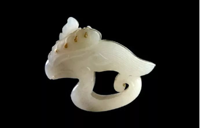 玉质白色。整体饰一凤首。高高的凤冠,头部以细长密集阴刻线表示毛发,细长眼,嘴部下端有一小圆孔,凤首下端有一鸡心形扣,可供挂系用。