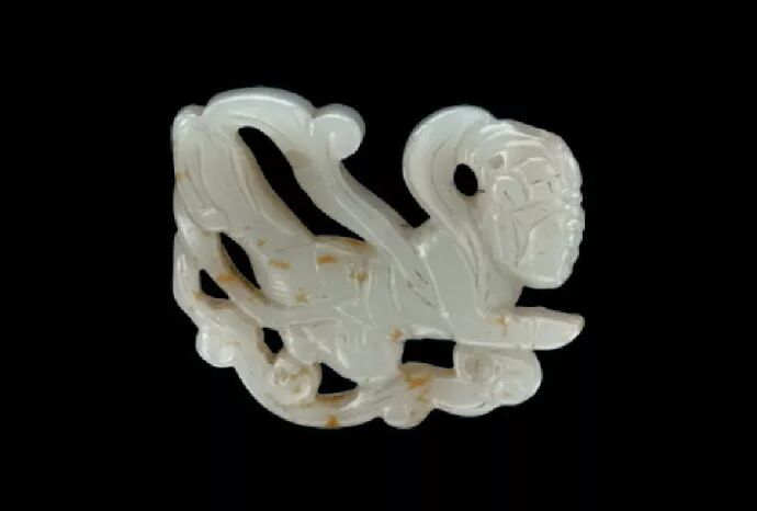 玉质青色,有铁褐色色沁。整体呈半圆形,片状,透雕一回首孔雀,小圆眼,口衔花枝,翅膀伸展,长长的尾羽后拖,呈排列的鳞片状。羽翅以阴刻线雕琢,平行排列。花枝疏朗,花大叶小,枝长而曲。此玉采用多层次的镂雕方法,颇有立体感,艺术水平较高。