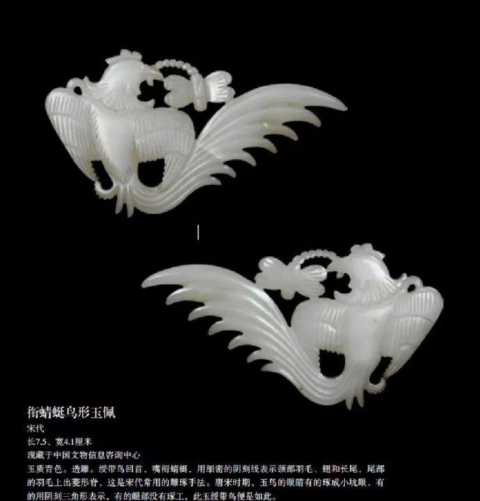 玉质青色。透雕。绶带鸟回首,嘴衔蜻蜓,用细密的阴刻线表示颈部羽毛、翅和长尾,尾部的羽毛上出菱形脊,这是宋代常用的雕琢手法。唐宋时期,玉鸟的眼睛有的琢成小坑眼,有的用阴刻三角形表示,有的眼部没有琢工,此玉绶带鸟便是如此。