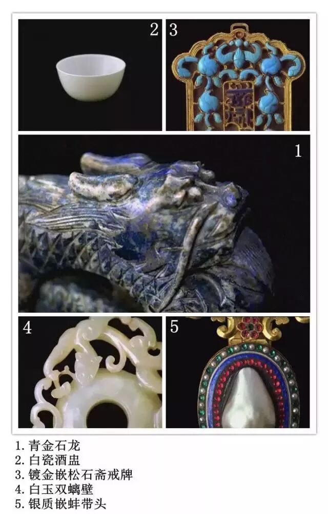 这件“紫檀云龙纹多宝格方盒”内藏47件珍玩。打开方盒,顶层托盘装有从春秋战国到辽、金、明、清时期的玉器。![]()