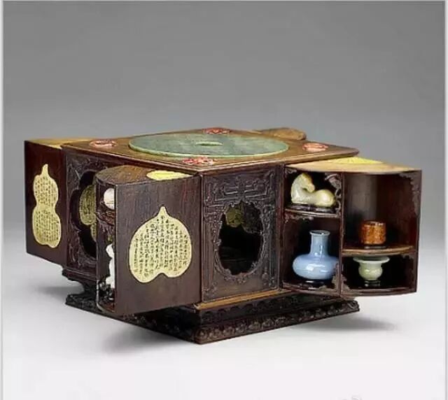 往往一件多宝阁,箱盖中有盒,盒中有匣,匣中又有屉,隐隐约约,辗转曲折,有时一个转钮,便见门,门之后,另有一番天地。![]()