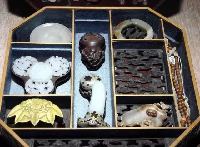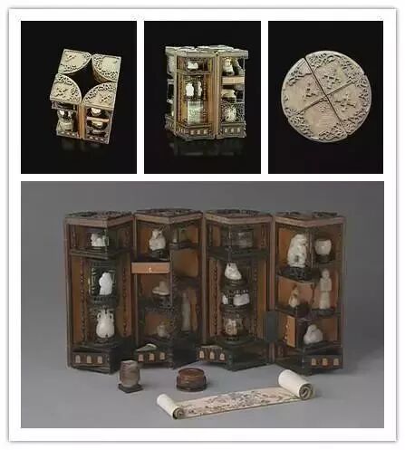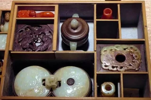 打开来看,不同的空间摆放着大小不同的珍玩,严丝合缝,不浪费一丝空间;![]()