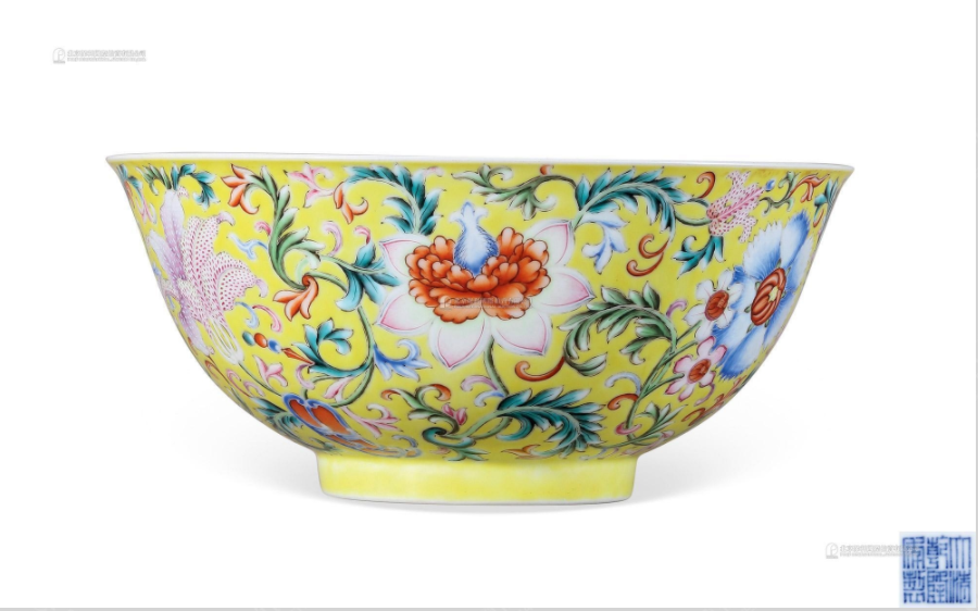 清乾隆 黄地洋彩花卉五福宫碗