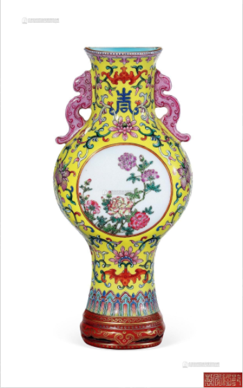 清乾隆 黄地粉彩开光富贵牡丹壁瓶
