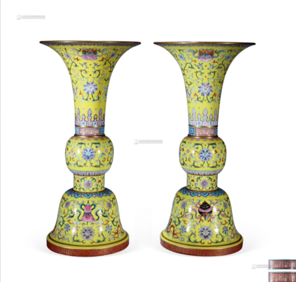 清乾隆 黄地洋彩缠枝莲托八宝纹花觚 (一对)