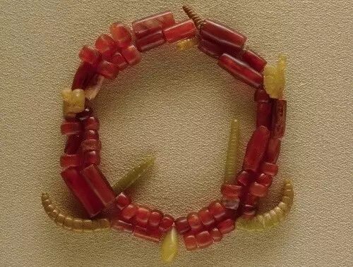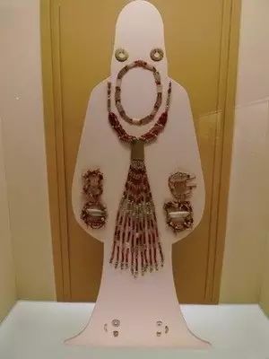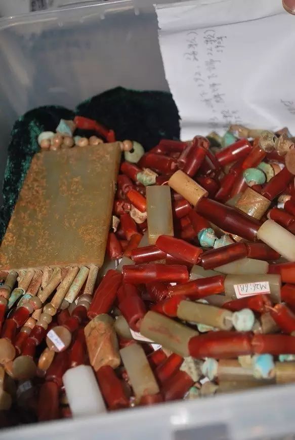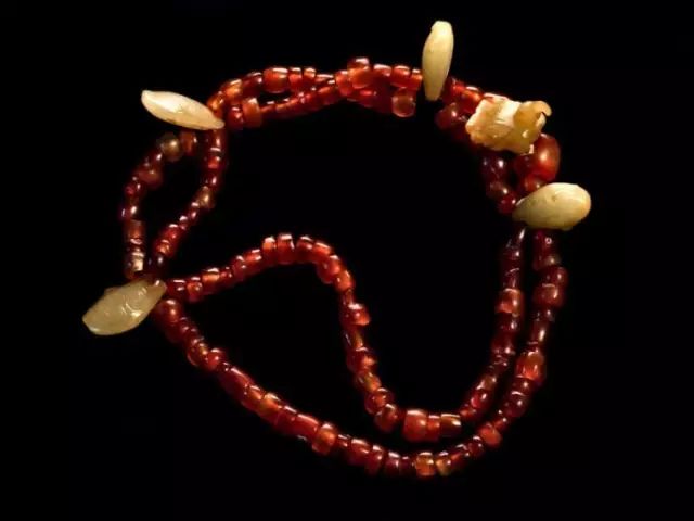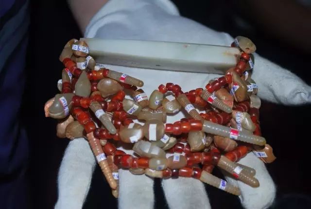 右手腕饰由1件方形牌、16颗玉蚕、 8颗玉龟、8颗玉贝、2件玉面兽和100颗玛瑙珠组成。值得一提的是,在细小的玉蚕上还巧夺天工地琢上了小米粒般的眼睛,且十分传神;玉龟身上绘有龙首细纹;这些具有有相当难度的加工工艺,充分反映了当时的玉器制作水平,为不可多得的玉器珍品。