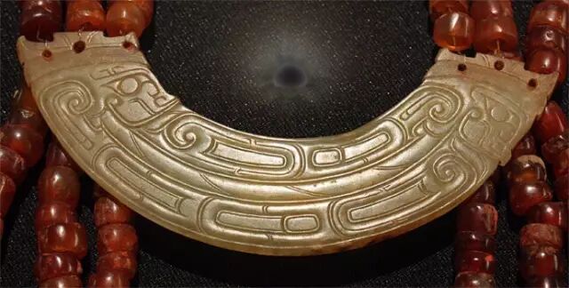 在组玉佩饰中,以七璜联珠和梯形牌饰最具代表性。也是陕西地区发现的等级最高的组玉佩饰。其中,人龙合雕璜尤其值得称道,小玉人的发束每毫米竞有5根,并且根根互不交错,堪称西周中期高超琢玉工艺的代表性作品。