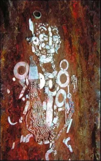死者佩戴的玉器和饰物遍及全身,这些玉器组合清楚,位置准确。计有面饰1组,颈饰四组,腕饰三组,握饰两组。仅左手玉握就由189颗玛瑙珠、16颗玉贝、16颗玉蚕、48颗玉龟、8颗玉珠和4颗玻璃珠编排组成,是我国目前发现的最为复杂和奢华的两周时期玉握。