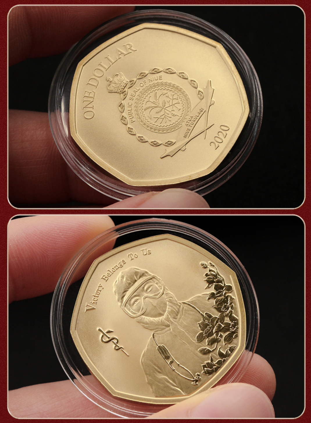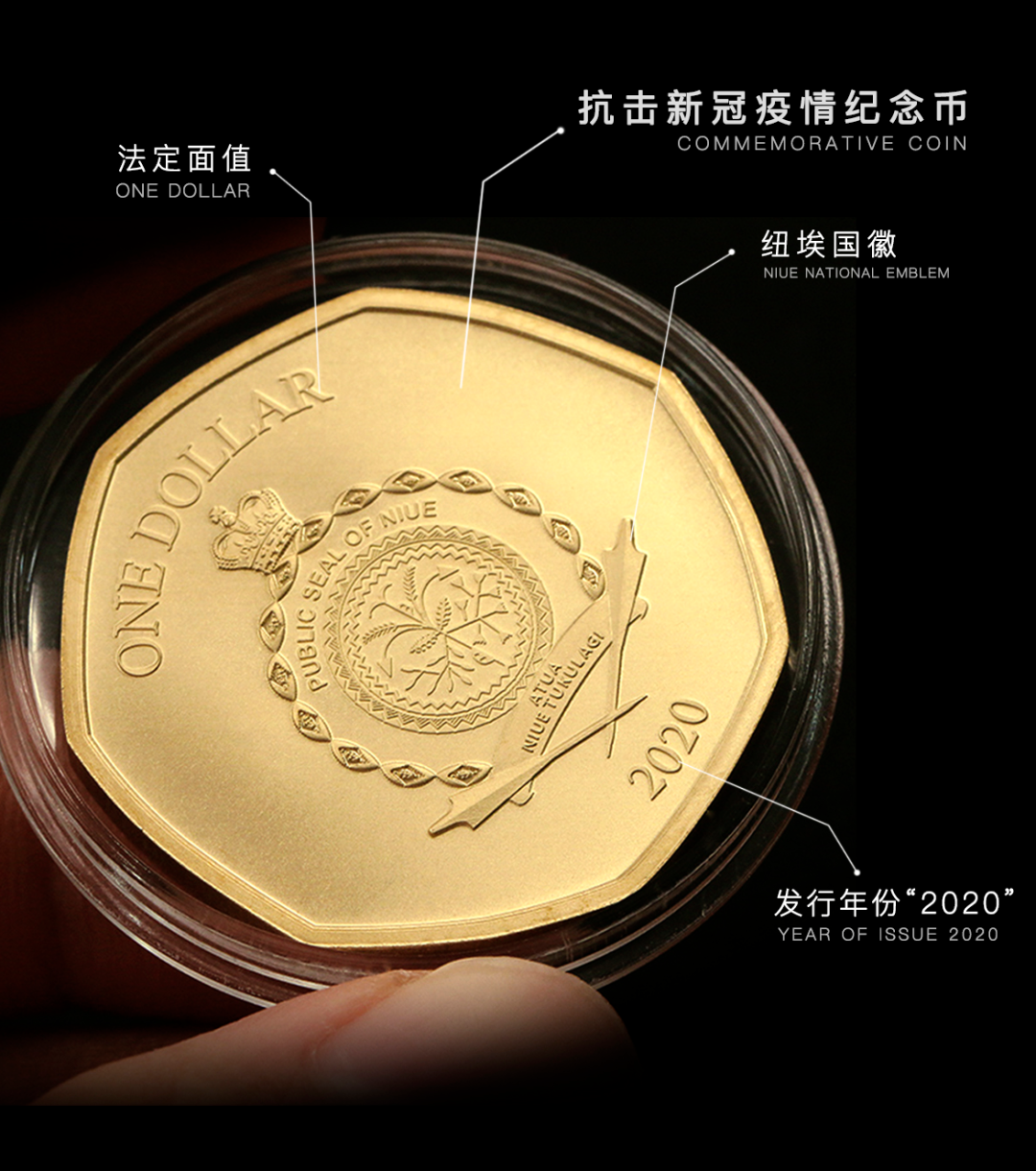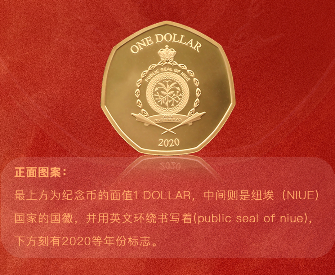 这枚纪念币的材质为黄铜,是一枚七边形的异形纪念币,纪念币的法定面值为ONE DOLLAR(1纽埃元),于2020年6月正式发行。