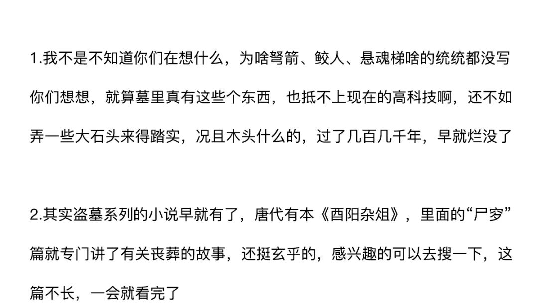 2.其实盗墓系列的小说早就有了,唐代有本《酉阳杂俎》,里面的“尸穸”篇就专门讲了有关丧葬的故事,还挺玄乎的,感兴趣的可以去搜一下这篇,不长一会就看完了