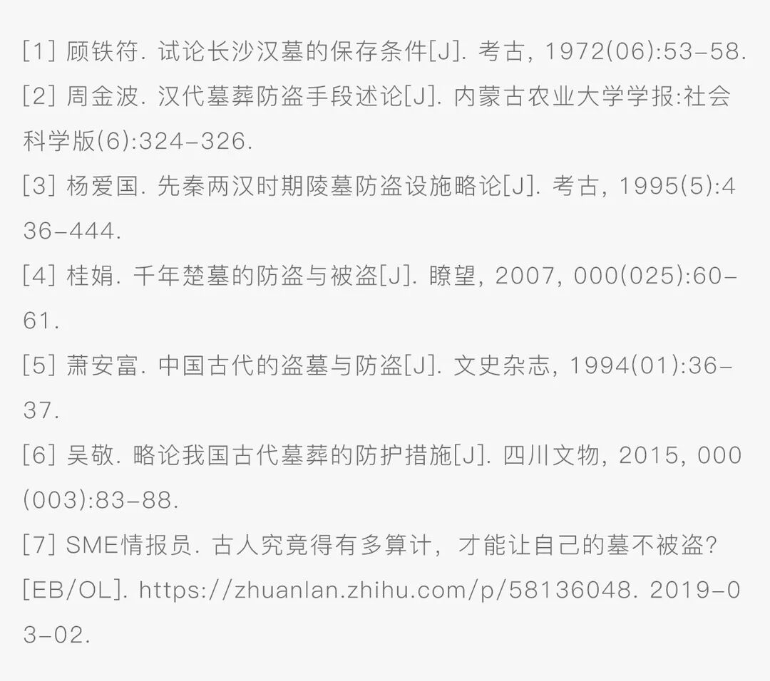 [6] 吴敬. 略论我国古代墓葬的防护措施[J]. 四川文物, 2015, 000(003):83-88.[7] SME情报员. 古人究竟得有多算计,才能让自己的墓不被盗?[EB/OL].https://zhuanlan.zhihu.com/p/58136048. 2019-03-02
