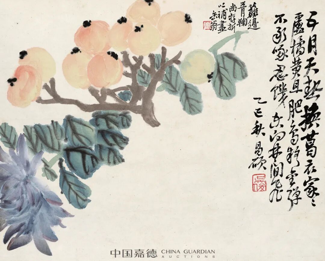 (一)五月天热换葛衣,家家卢橘黄且肥。鸟疑金弹不敢啄,忍饥空向林间飞。乙巳秋,昌硕。篱边五月菊尚存,折以补画。缶翁。