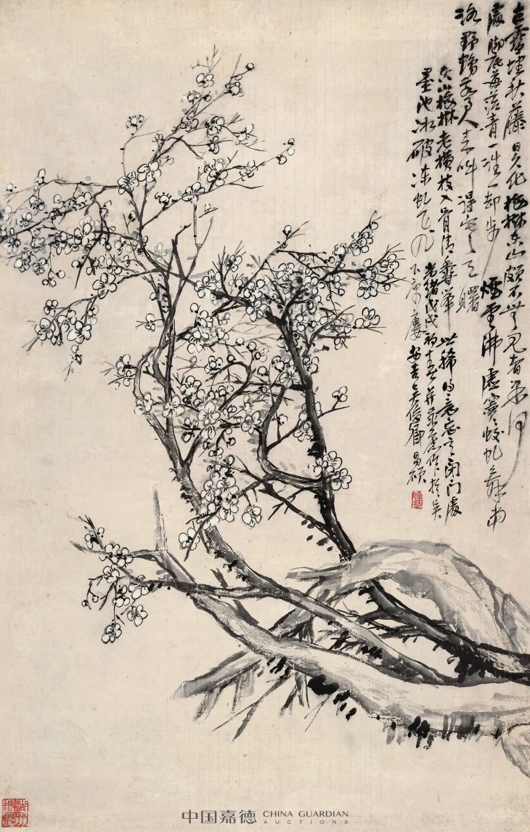 题识:古雪埋秋藤,日久化梅树。空山坡不无,见者果何处。脚底莓苔青,一往一却步。烟云沸虚窦,蛟虬舞当路。野鹤惊人来,叫得寒天曙。空山梅树老横枝,入骨清香举世稀。得意忘言闭门处,墨池冰破冻虬飞。光绪戊戌初春,并录旧作于吴下寓庐。安吉吴俊卿昌硕。