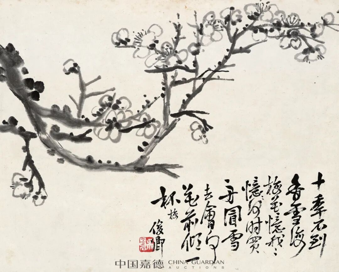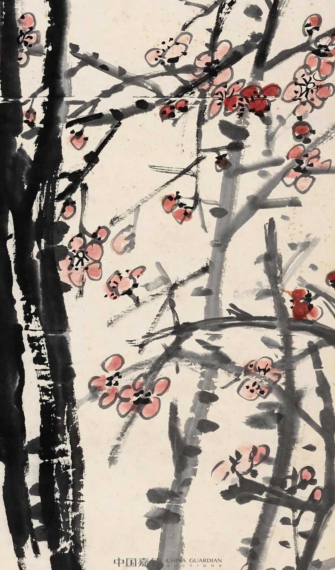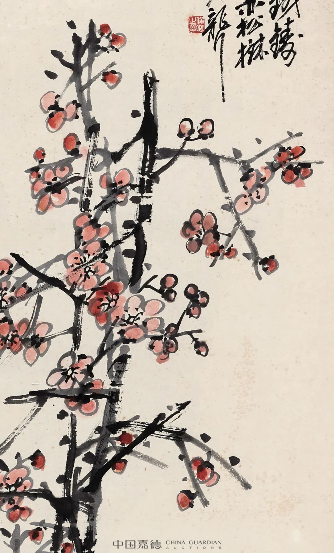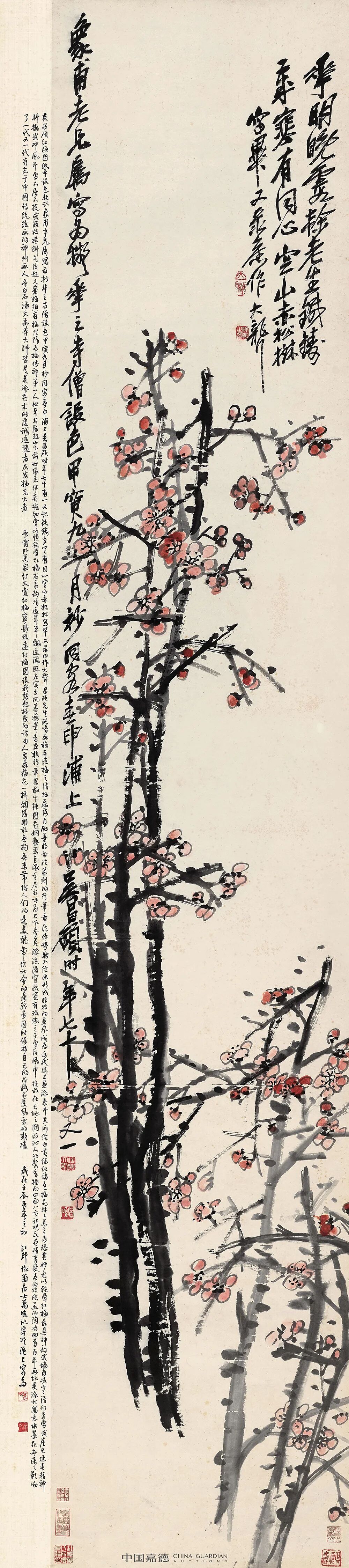 裱边:万峻池题:吴昌硕红梅图纸本设色,款识象甫老兄属写。为拟华之高僧设色。甲 寅九月杪同客春申上。吴昌硕时年七十有一,又误铁铸岁寒有同心,空山赤松林。写毕又录旧作。大聋昌硕先生酷嗜画梅,并从梅之清标磊落自励。善将书法篆刻的行笔章法体势融入绘画,形成独特的画风,成为近代海上画派泰斗。