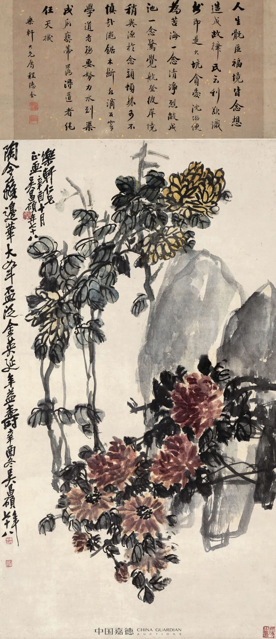(二)象甫老兄属写。为拟花之寺僧设色。甲寅九月杪同客春申浦上。吴昌硕时年七十又一。钤印:俊卿大利、昌硕。