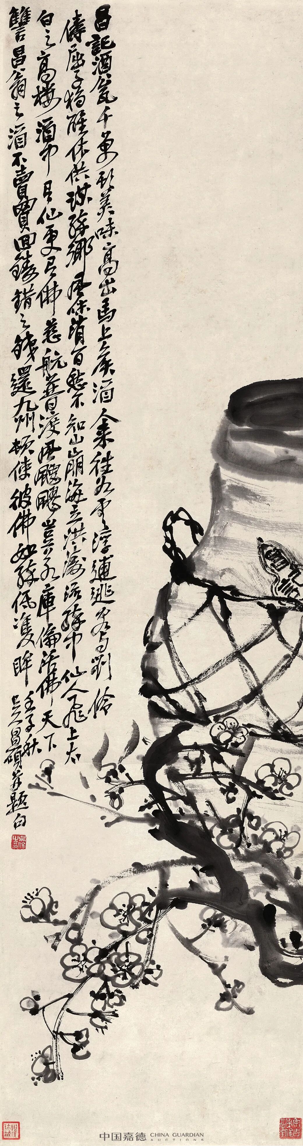 题识:昌记酒瓮千万头,美味高出马上矦。酒人来往如云浮,逋逃客与刘伶俦。屈子独醒休供谋,醉乡风味消百愁。不知山崩海立洪涛流,醉中仙人飞上太白之高楼。酒中有仙更有佛,慈航普渡风飕飂,岂若库伦活佛天下雠。昌翁之酒不卖,买回铸错之铁还九州岛,顿使彼佛如醉低双眸。壬子秋。吴昌硕并题句。