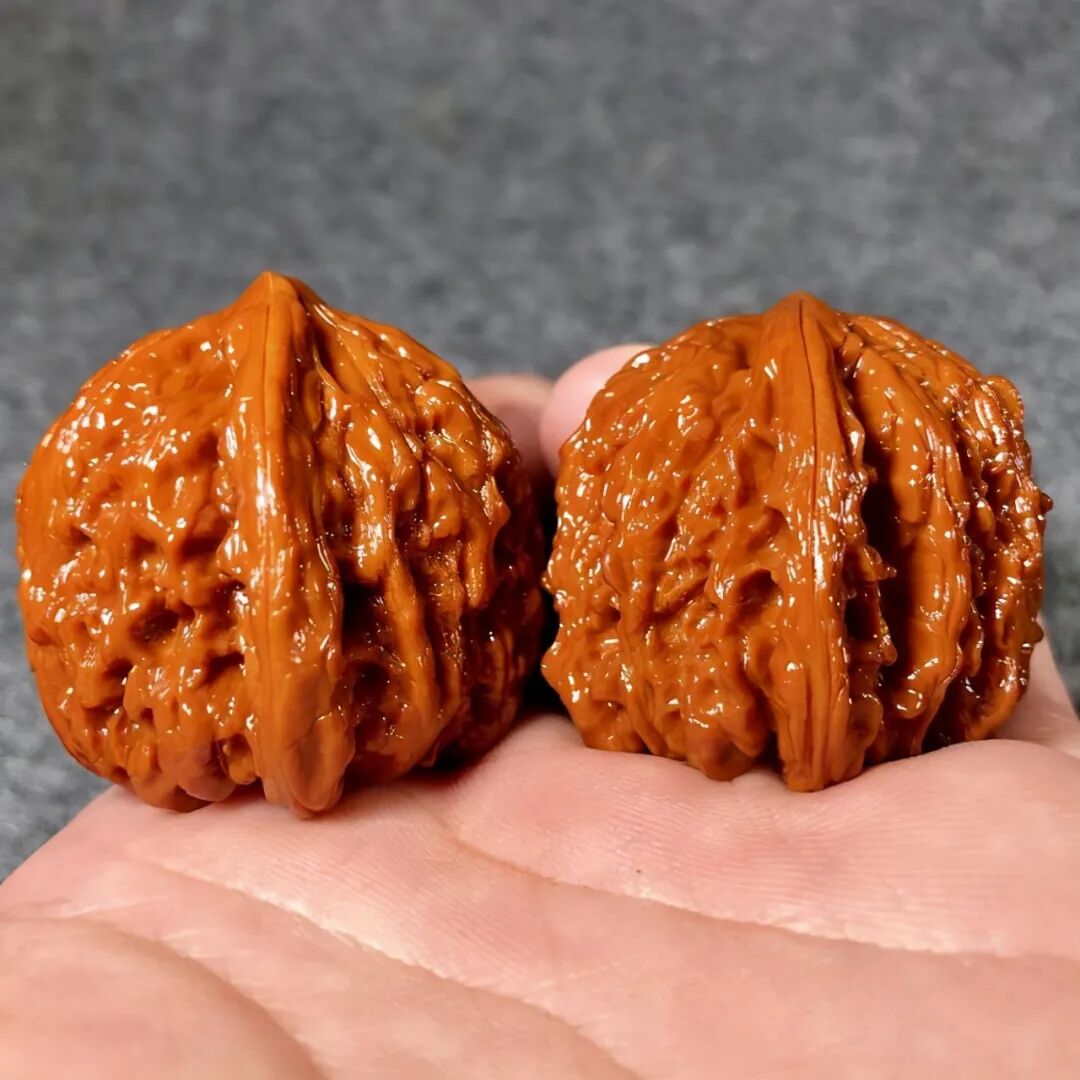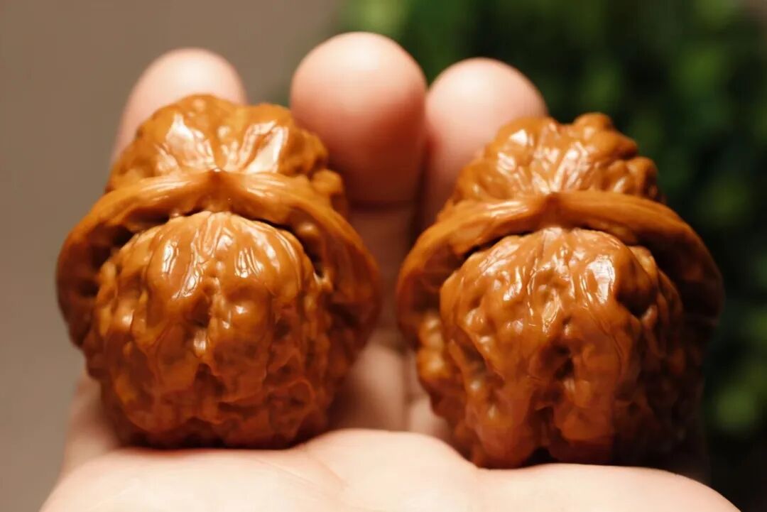 再随着时间的推移,文玩核桃表面的纹理逐渐磨损,手掌能够接触到的表面积增加,表层的蜡类析出物也随着长年的盘玩不断经历挤压——凝固——挤压——凝固的过程。分子间的水分逐渐丧失,固化程度加剧,从而使整个文玩核桃通体包浆,深入度达到“入木三分”的地步。这时的文玩核桃,就可以叫做“挂瓷的核桃”了。