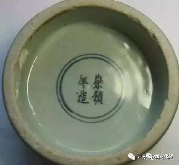 早期盘底依然下塌,足墙逐渐变矮,釉与露胎处的结合部“火石红”现象减少。晚期时,足墙逐渐变得较垂直并且相应加高,外足墙及底显现跳刀痕,足心呈下凹的弧状,犹如把“馒心底”翻转过来一样,在内足根之间形成较大弧度的椭圆形。