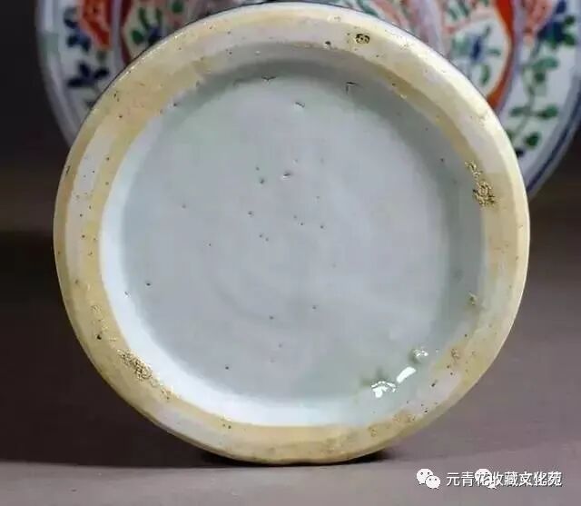 自万历晚期开始用的玉璧底开始流行。一般认为其“自外足端向内下方斜削的角度较大”。实际上天启前后宽圈足内足墙多离心,挖足较深;