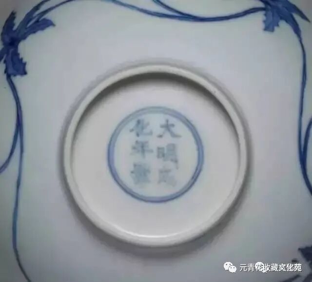 晚期足外墙几乎全部饰以青花圈线,并且从此沿用不变。较好一类的瓷器,在足外墙圈线内,开始加绘简单纹饰,成化时增多。多数外足墙端斜削并落于台面,内足墙端有棱边感。个别开始有外足端滚圆的现象。这种形式是明代民窑上乘器皿的特征之一。
