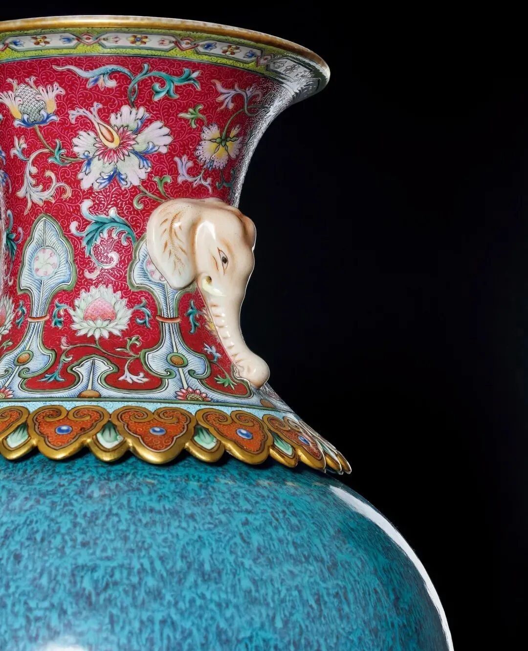 此转心瓶用色及纹饰精工至极,独具西洋韵味的缠枝花卉,胭脂红釉色为底的颈部,两侧收紧处饰有造型灵动的双象耳,象首的肤纹褶皱刻画极为细腻,象鼻轻垂,眼神坚毅,寓意“太平有象”之美好,为乾隆八年至十年之间所特制。