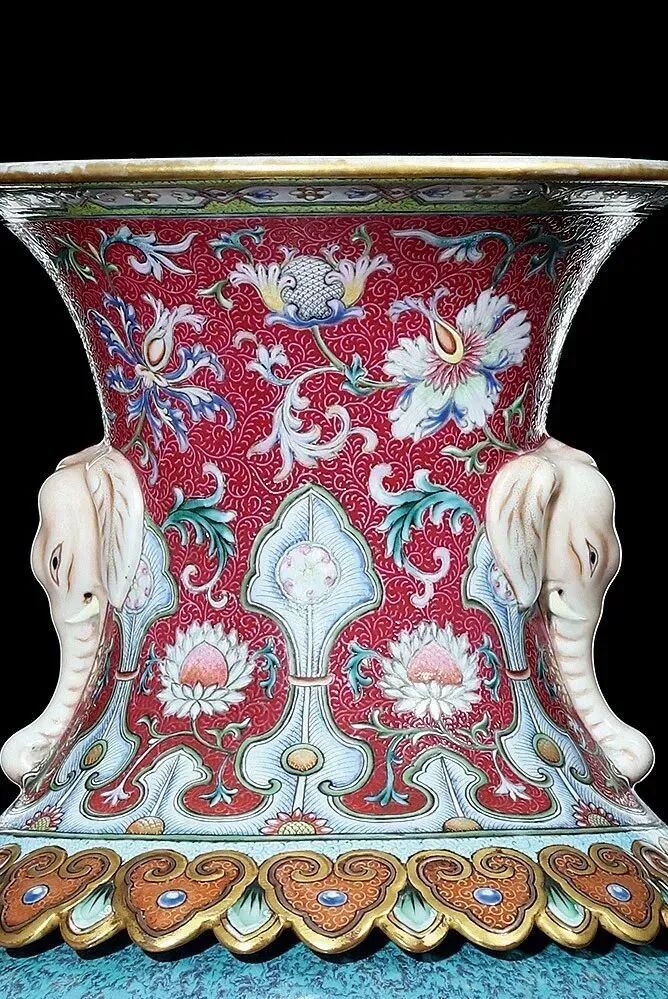 本器撇口束颈,两侧各饰一象耳,丰肩鼓腹,足部外撇。口足皆以胭脂红釉为地,轧道工艺锥剔凤尾形卷草纹,锦地华美繁丽;其上衬洋彩花卉,洋莲曼妙婉转,菊花及变形蕉叶纹间隔而饰,肩部、胫部凸雕如意云纹各一周,金灿光艳;两侧象耳栩栩如生,彩绘细腻,毫发毕现,眼含悦乐;腹部饰炉钧釉,红紫、蓝绿交融激荡,釉色近雍正时期特色。足内青花书“大清乾隆年制”六字三行篆书款。