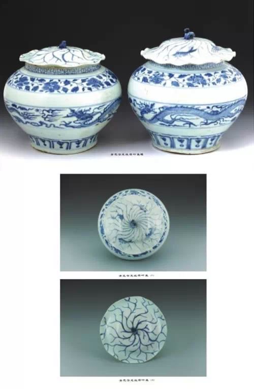 荷叶盖罐均为广口,溜肩,鼓腹, 腹下渐收,胫部略外扬,浅圈足,素胎多见积釉斑。
