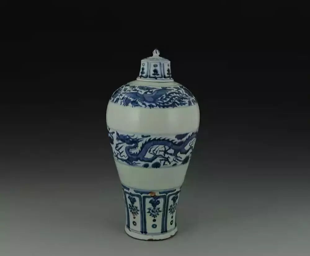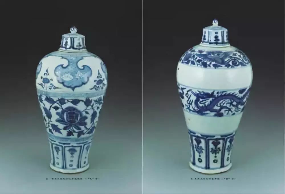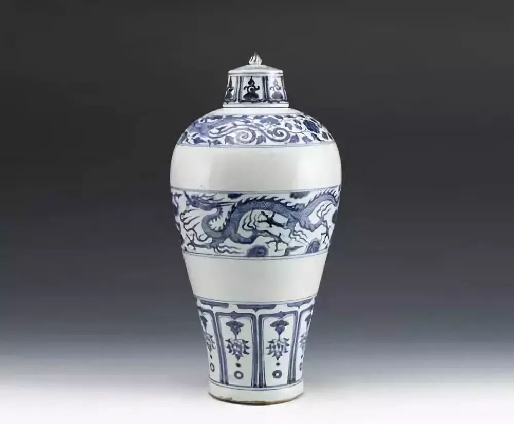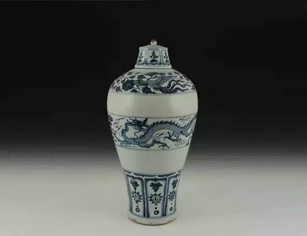龙纹梅瓶一改元青花牡丹纹饰繁缛之常规,以上下空白突出双龙追逐天空般的艺术效果,可谓匠心独具。
