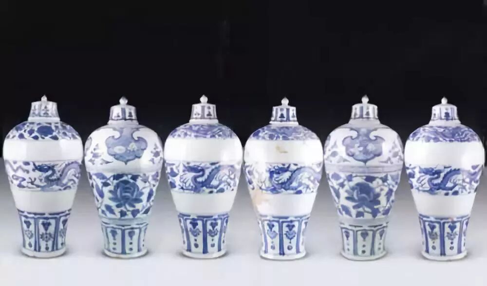 6件梅瓶均带盖,元青花梅瓶带盖者甚少,