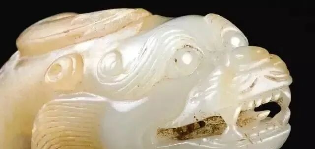 这件西汉玉辟邪白玉带皮,玉质温润如脂,造型威猛,充满动感。这件白玉的辟邪造型比较特别,是曲身引颈回首,双目圆睁,张嘴露齿,毛髮后披,脑后有角。下颚又抵脊背,有双翼。卷尾,尾尖饰凤首,尾翼反转撑地。从雕工上看雕琢精緻细腻,线条流畅自然,工艺娴熟,尤其头部鬚髮,尽显工匠之高超技艺。