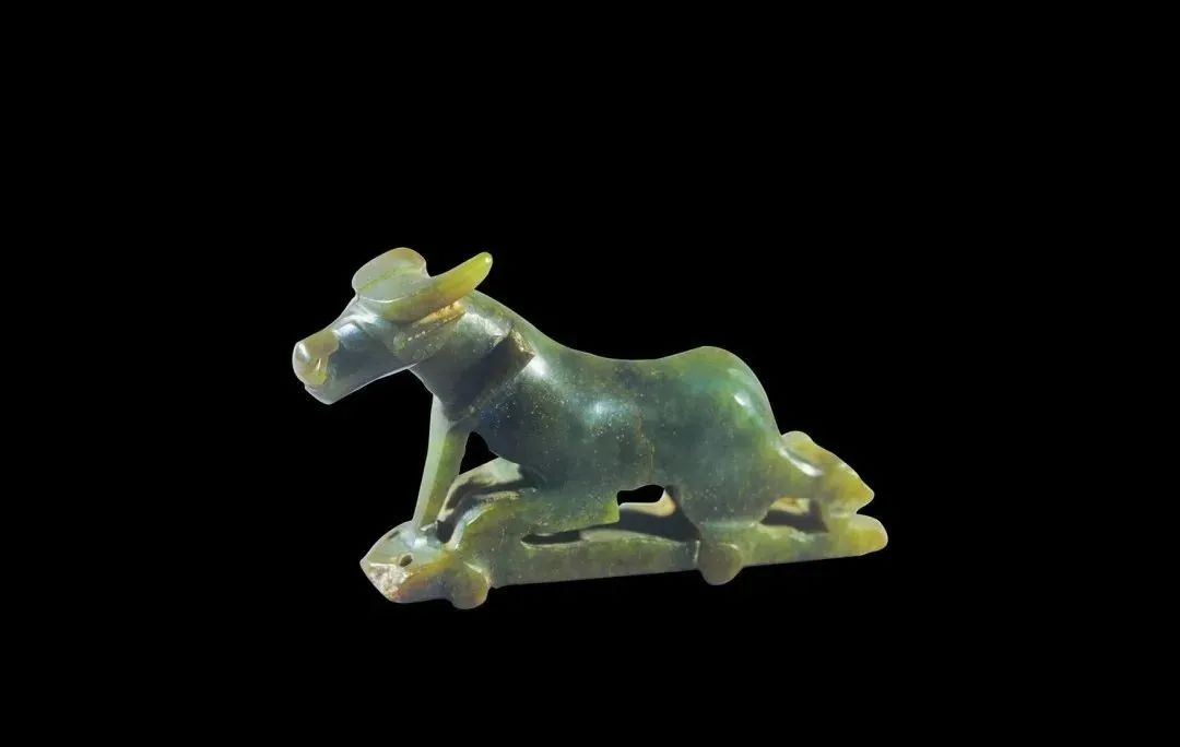 春秋戰國時期,玉牛較為少見,但自漢代始,玉牛又開始出現,並延續至魏晉南北朝。漢代的牛形玉器,自西漢時起就有所見,此期的玉牛,雖數量相對少,但其造型較大,皆多呈足前伸的伏臥式,這與此前玉牛多呈跪臥式,或作直立式等形成鮮明的對比。