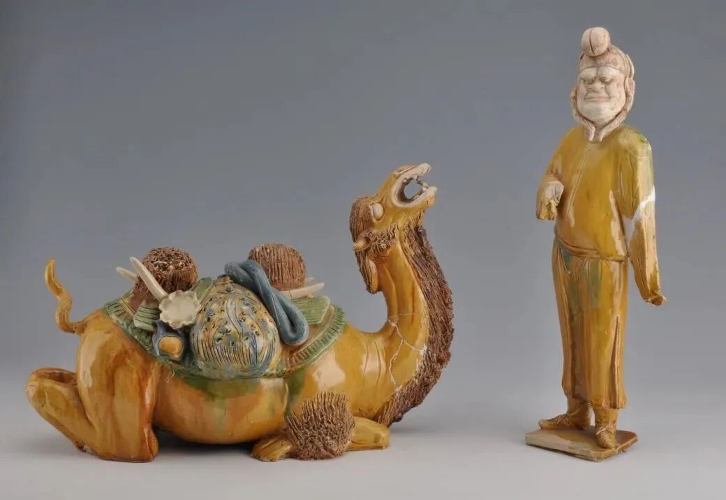 唐 三彩载物骆驼俑(左)、三彩胡人俑(右)