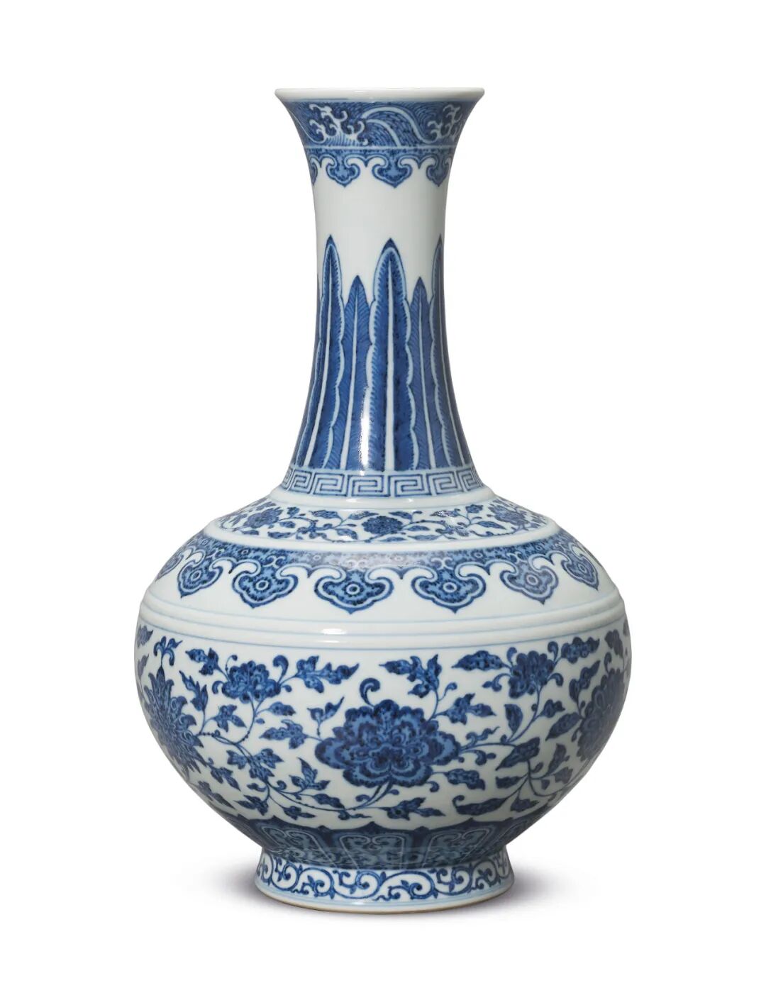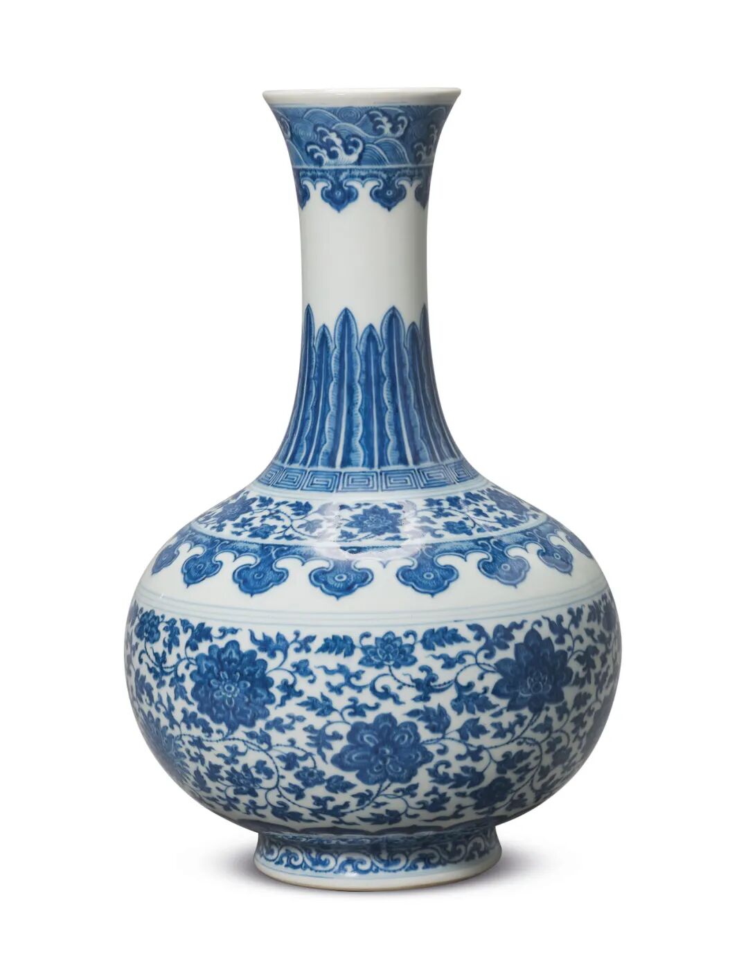 撇口,细颈,垂腹,圈足。通体绘五组青花纹饰,以双线相隔。颈饰卷草纹和蕉叶纹;肩饰折枝牡丹,月季,山茶和莲花;腹绘四朵缠枝莲花,枝叶相缠;近足处绘浪涛纹。此器造型秀丽俊俏,发色鲜明,釉色莹润。