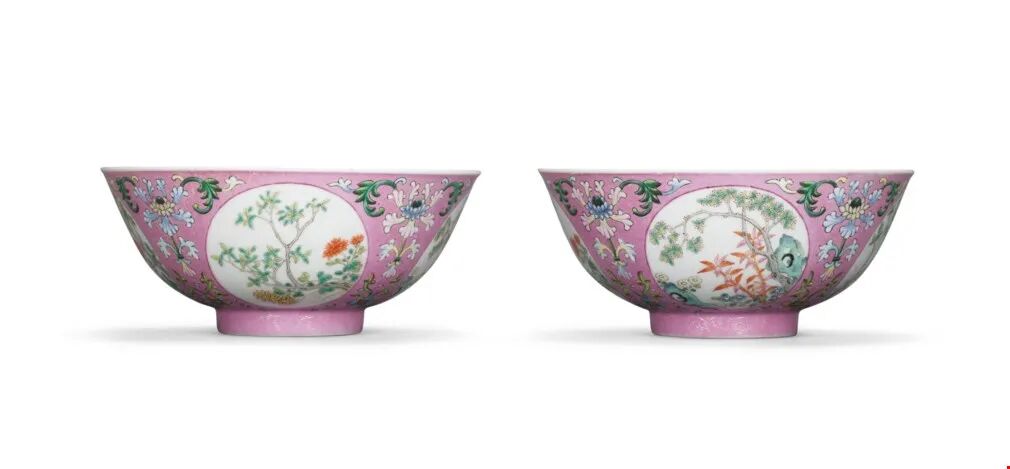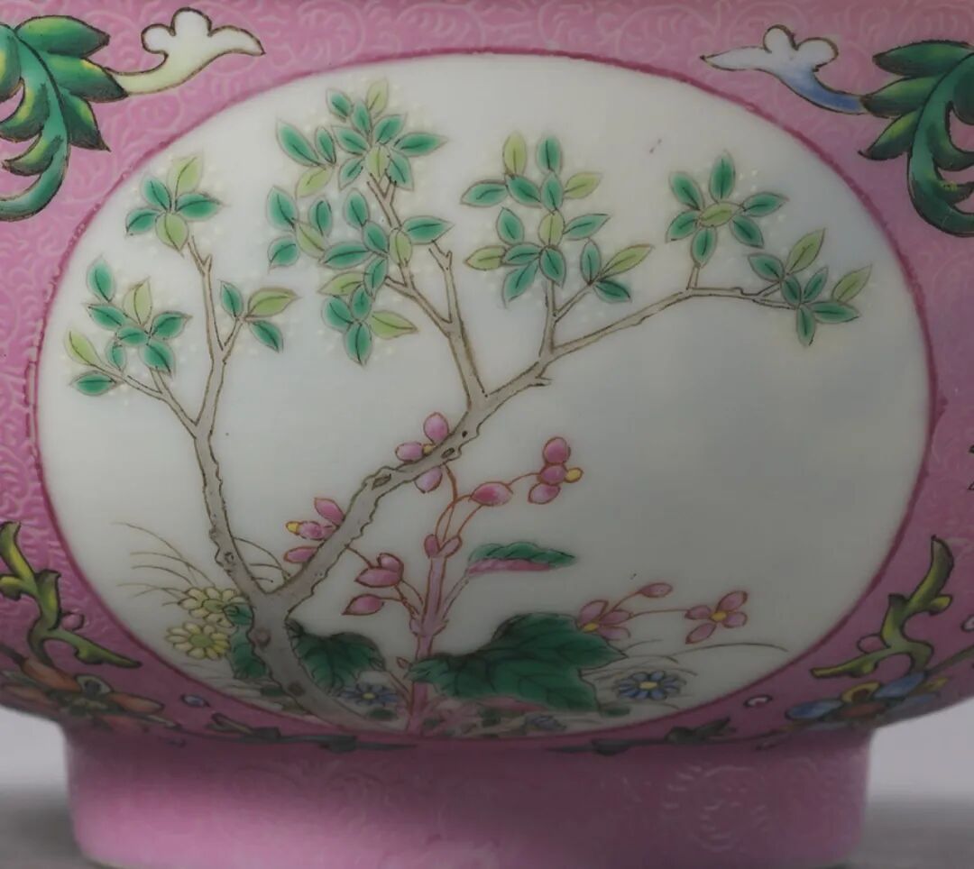 清道光 粉红地轧道外粉彩内青花开光花卉玉兔纹盌一对