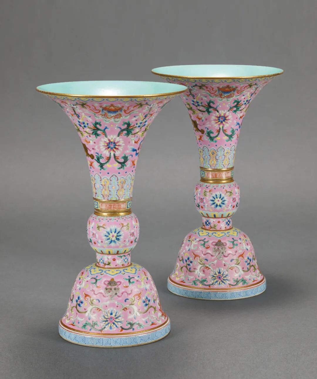 清嘉庆 粉红地粉彩八吉祥缠枝莲纹花觚一对