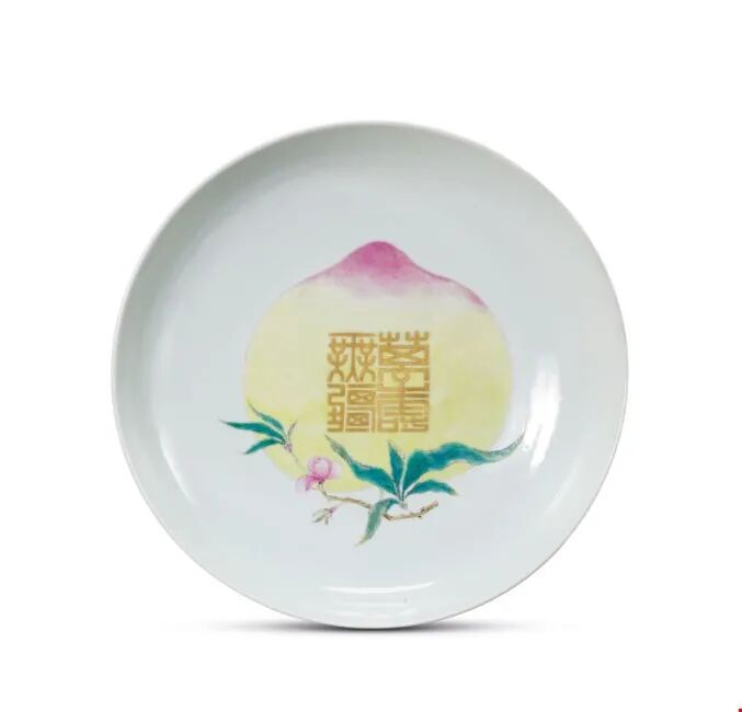 清雍正 外胭脂红釉内粉彩“万寿无疆”桃纹盘