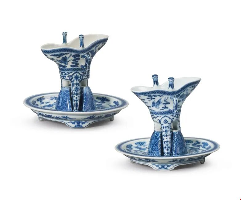 清乾隆 青花海水江崖云鹤纹爵及托一组四件 四字篆书款