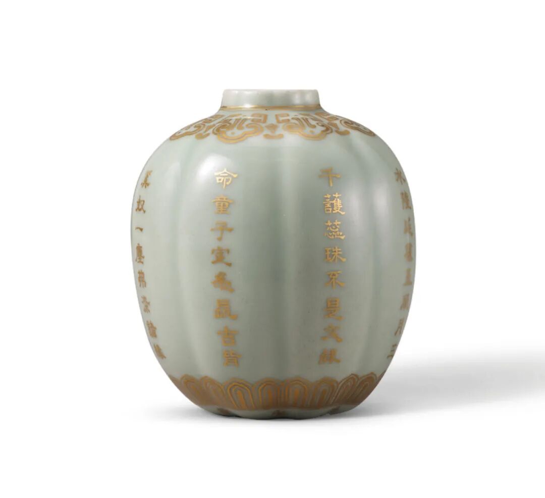 清乾隆戊辰年(1748年) 青釉地描金御题诗瓜棱小罐