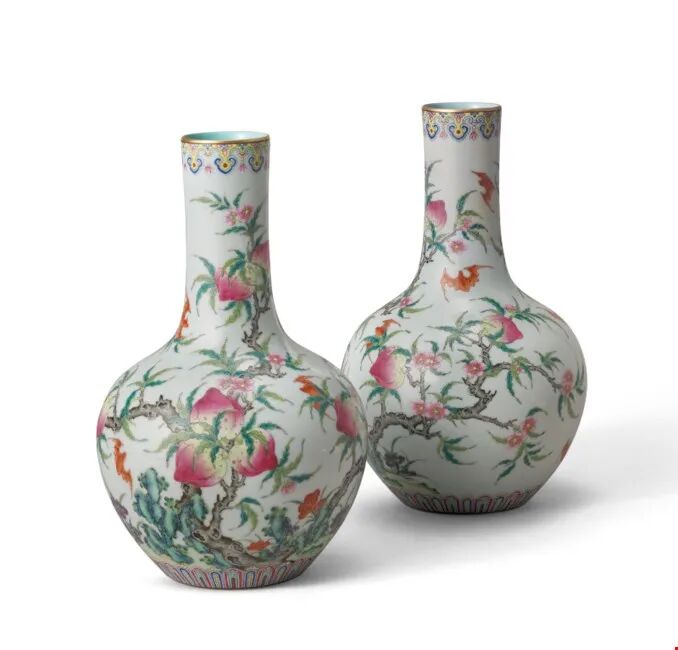清道光 粉彩九桃天球瓶一对 矾红六字篆书款