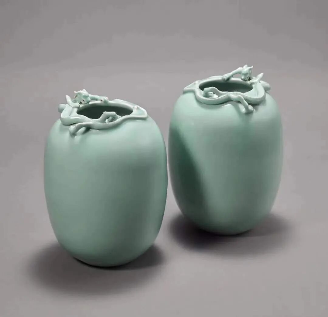 清乾隆 粉青釉堆塑螭龙纹冬瓜尊一对