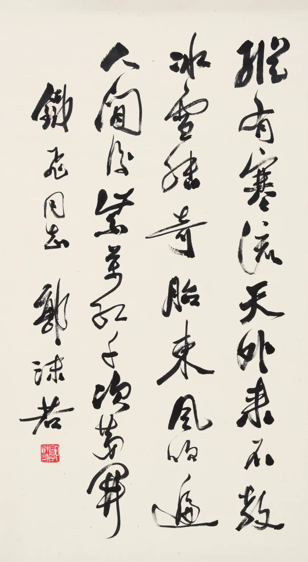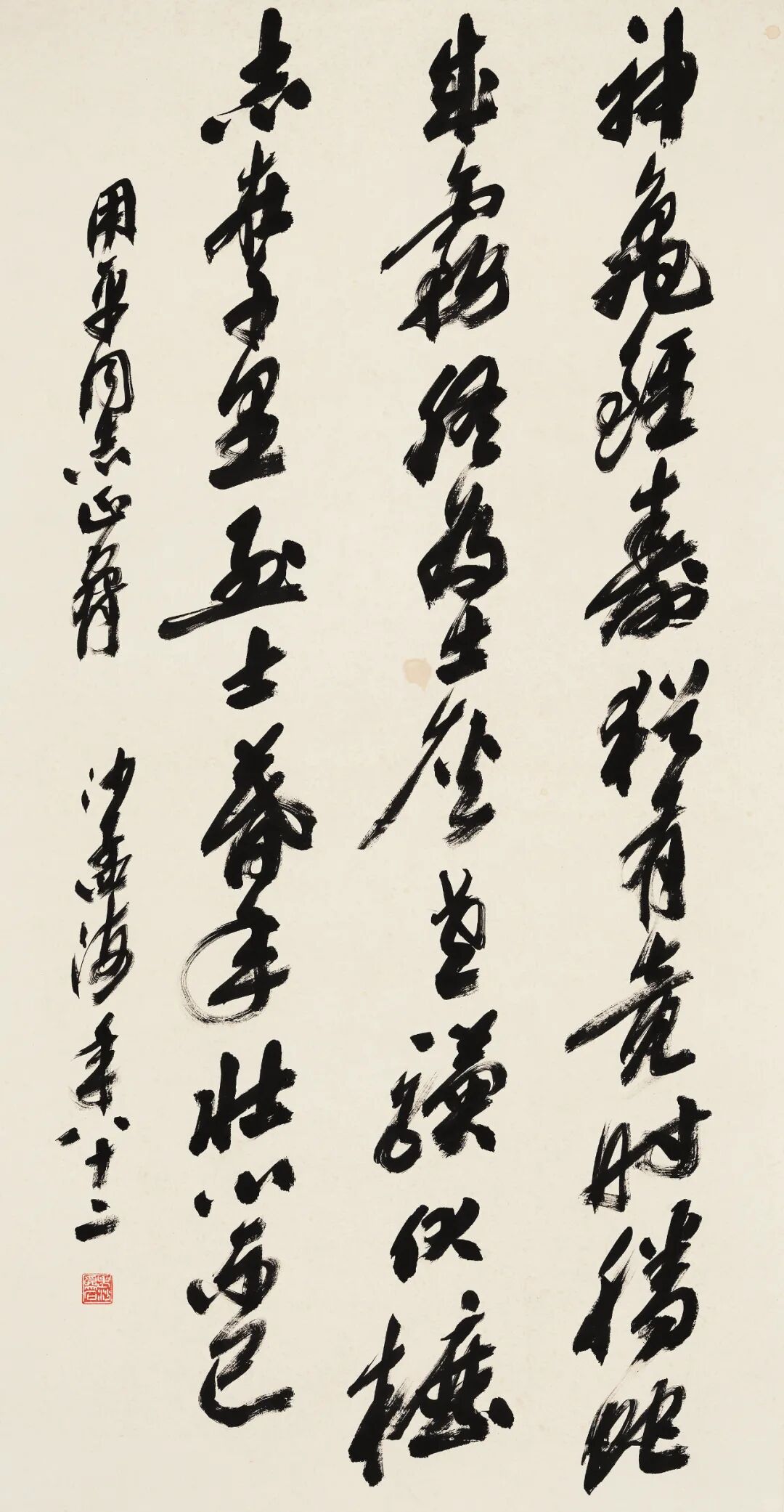 郭沫若和高二适所书风格不类,用笔和气势倒有些殊途同归。鼎堂赠原浙江丽水地委书记殷铁飞的《行草七言诗》,是其后期标准风格之作,纵横排奡、金钩铁画,气势张扬横溢;南京文物公司旧藏之高二适赠原南京首任检察长丁山的《草书和毛主席诗》书自己所作七律,略采章草笔法,飞扬耸动,流利爽劲。不过,力能扛鼎的,还得是沙孟海。本件若翁书赠曹用平之《行书曹操诗》沉着痛快,正与阿瞒横槊赋诗同一气度襟怀。