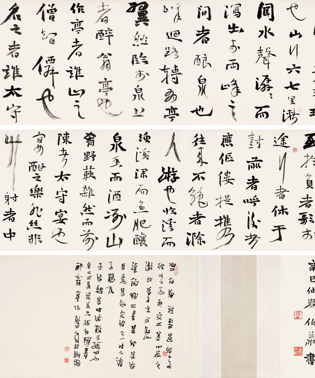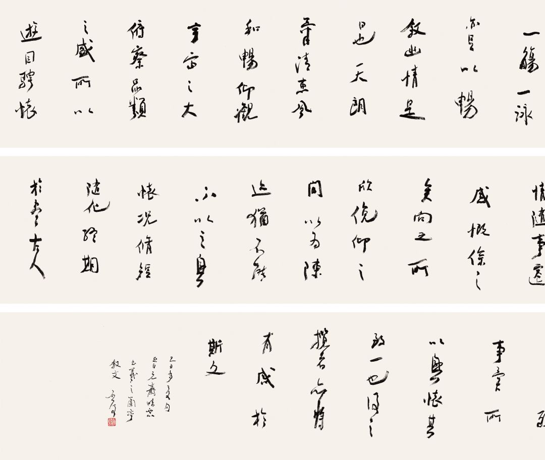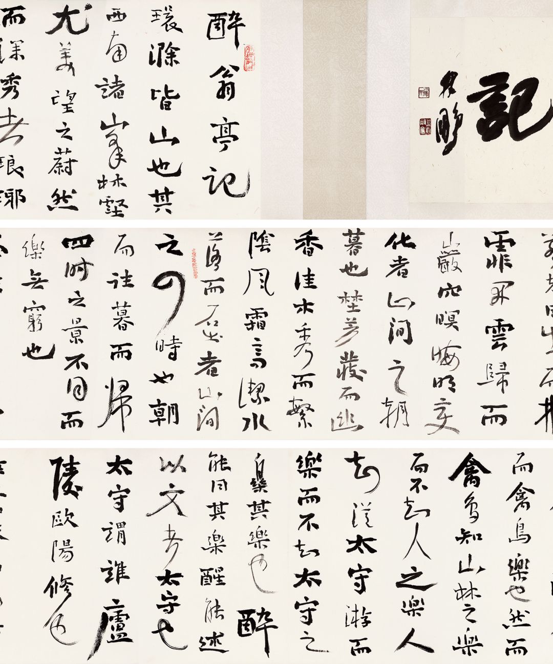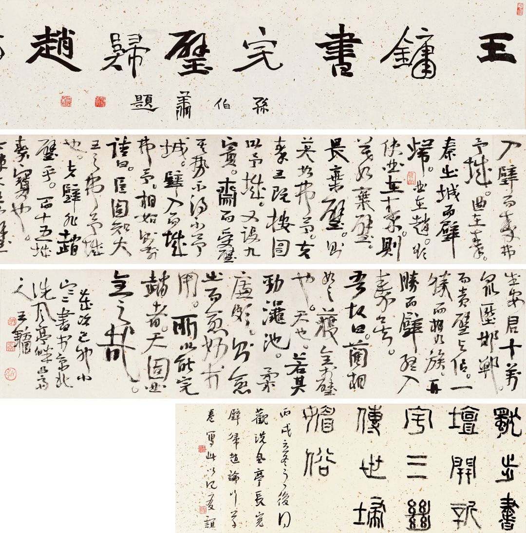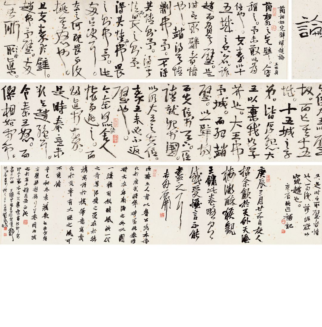 由同一藏家提供的一批当代书法大家的作品也相当精彩,这些作品均系千禧年前后诸人应委托人之请书就,其中王镛《草书〈完璧归赵论〉卷》集孙伯翔题引首、刘正成等尾跋,恐怕是近年市场所见最为引人入胜的凸斋手迹了。某机构提供的魏启后《草书兰亭序卷》与陈大羽《行书李白诗卷》亦均系应委托人之请所书,魏书尺寸宏阔,风貌疏朗,陈书为其南京化工厂闲居时期所作,笔致辐辏。