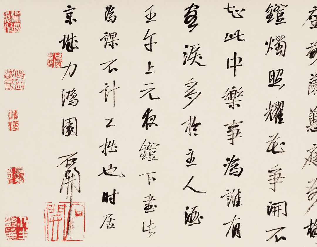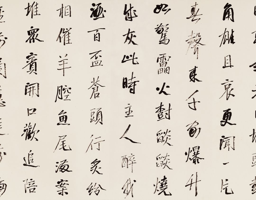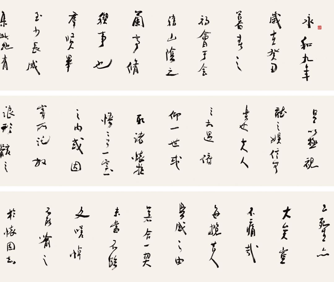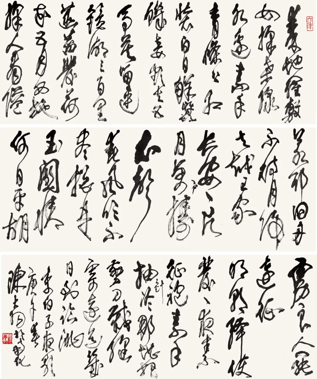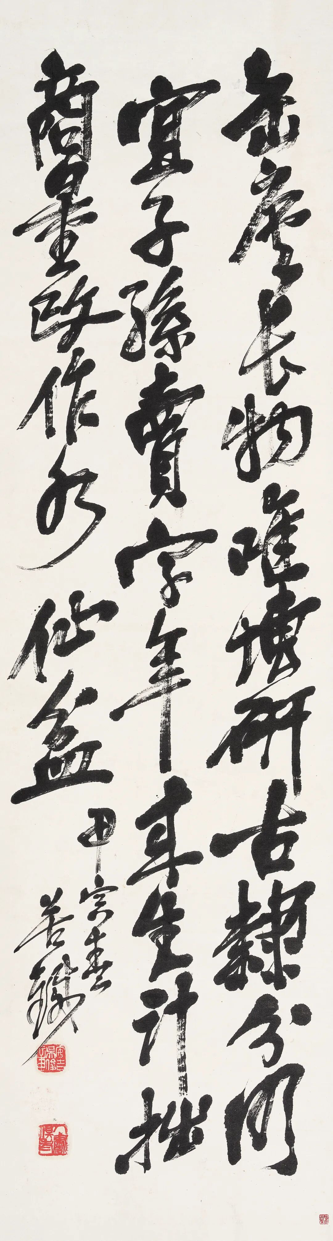 由同一藏家提供的一批当代书法大家的作品也相当精彩,这些作品均系千禧年前后诸人应委托人之请书就,其中王镛《草书〈完璧归赵论〉卷》集孙伯翔题引首、刘正成等尾跋,恐怕是近年市场所见最为引人入胜的凸斋手迹了。某机构提供的魏启后《草书兰亭序卷》与陈大羽《行书李白诗卷》亦均系应委托人之请所书,魏书尺寸宏阔,风貌疏朗,陈书为其南京化工厂闲居时期所作,笔致辐辏。