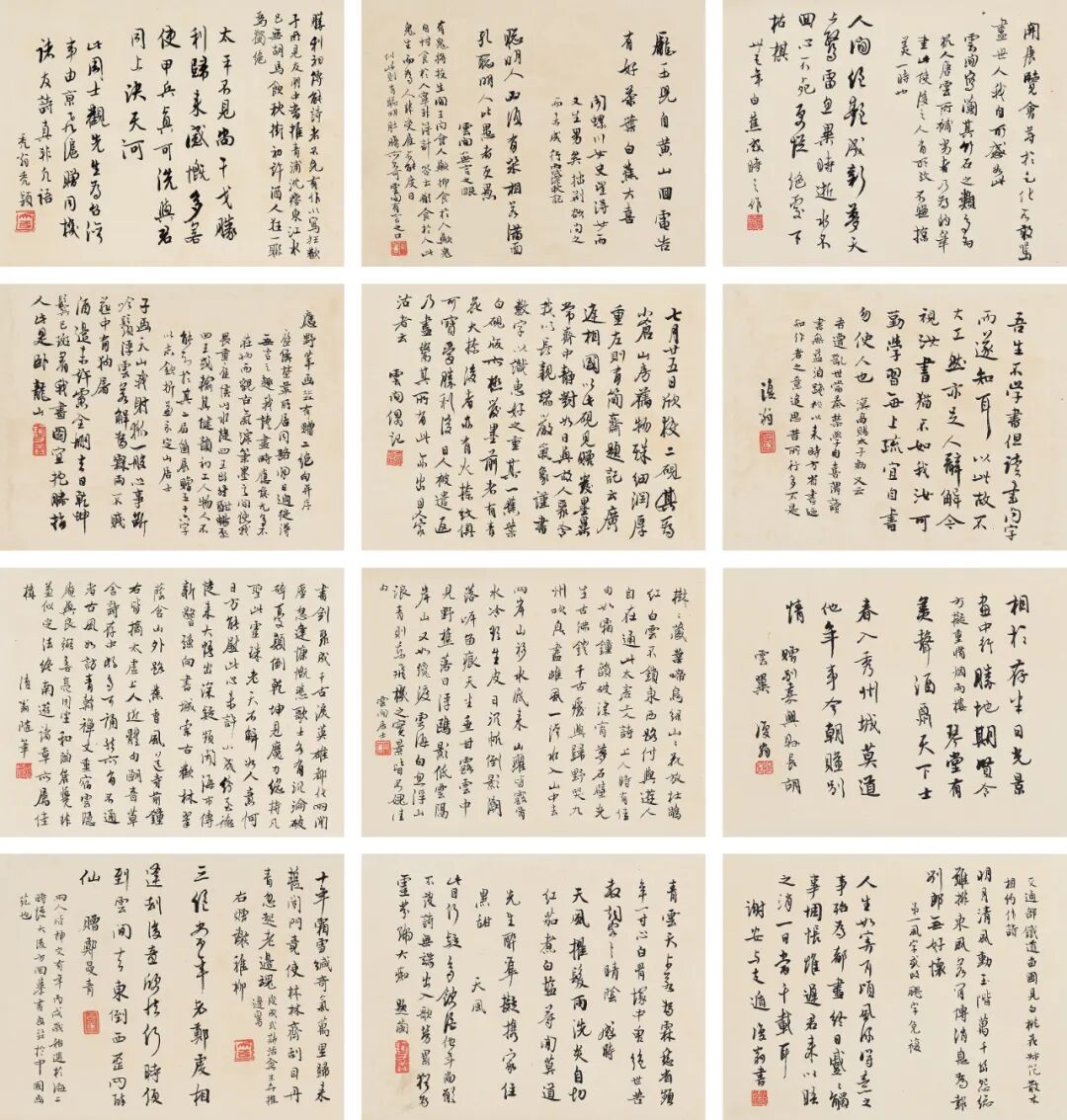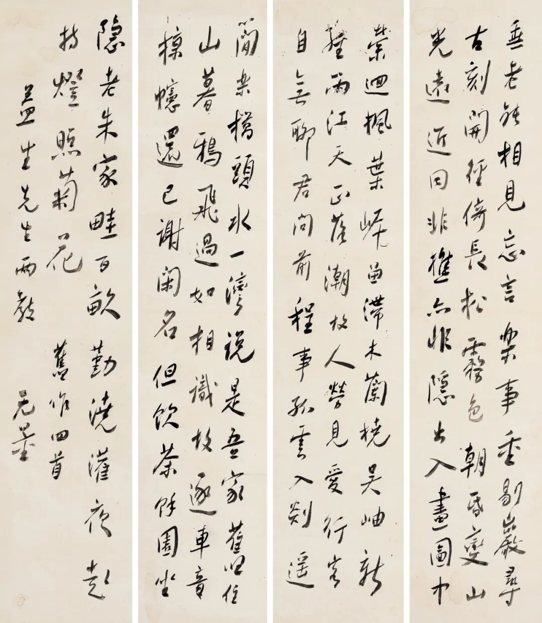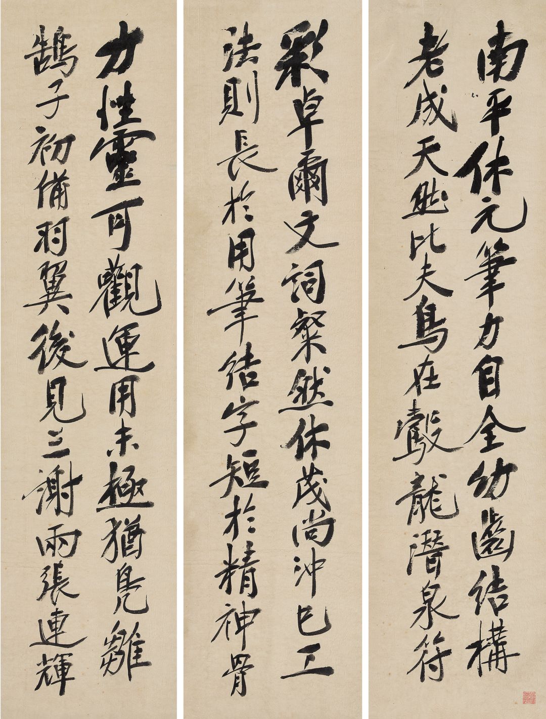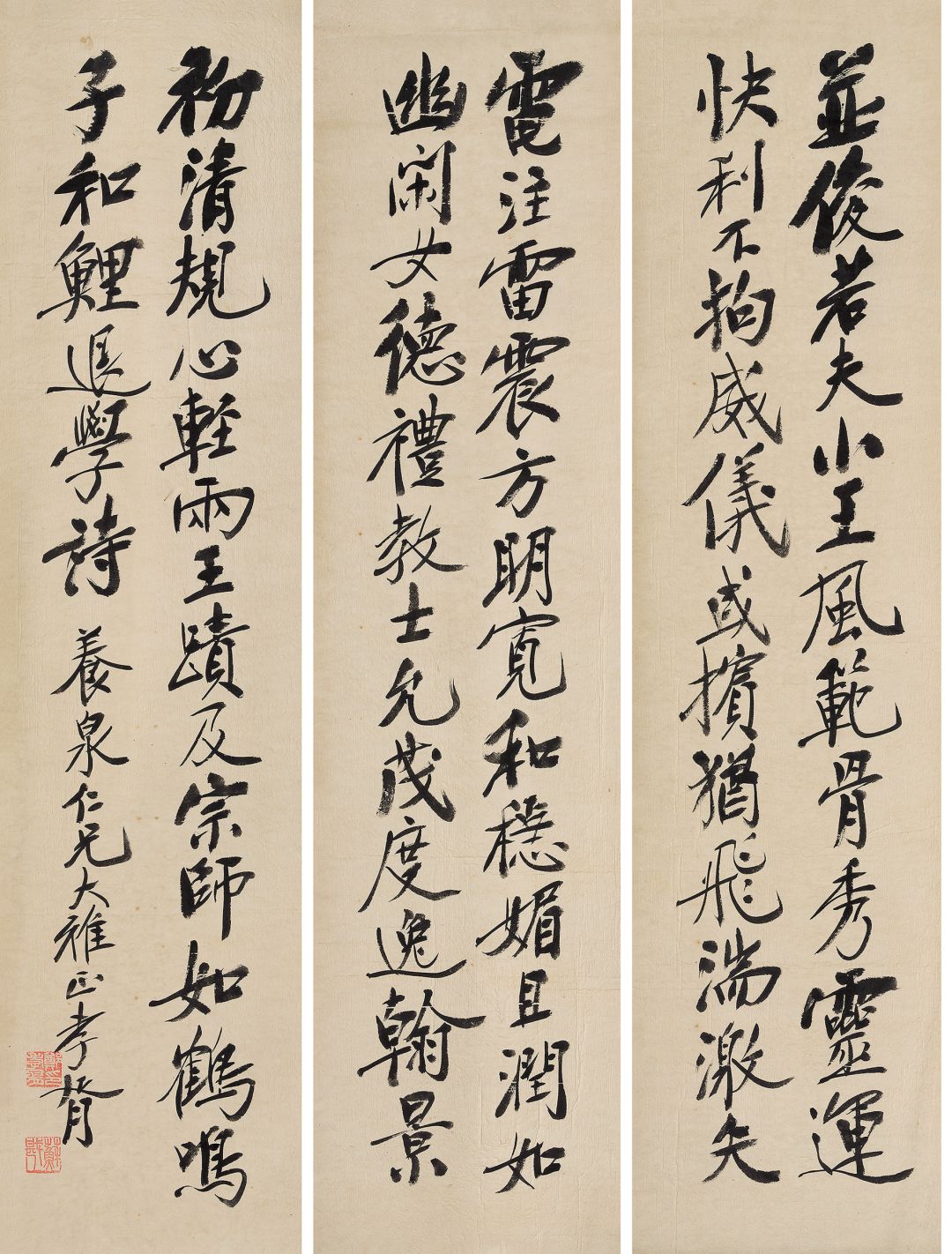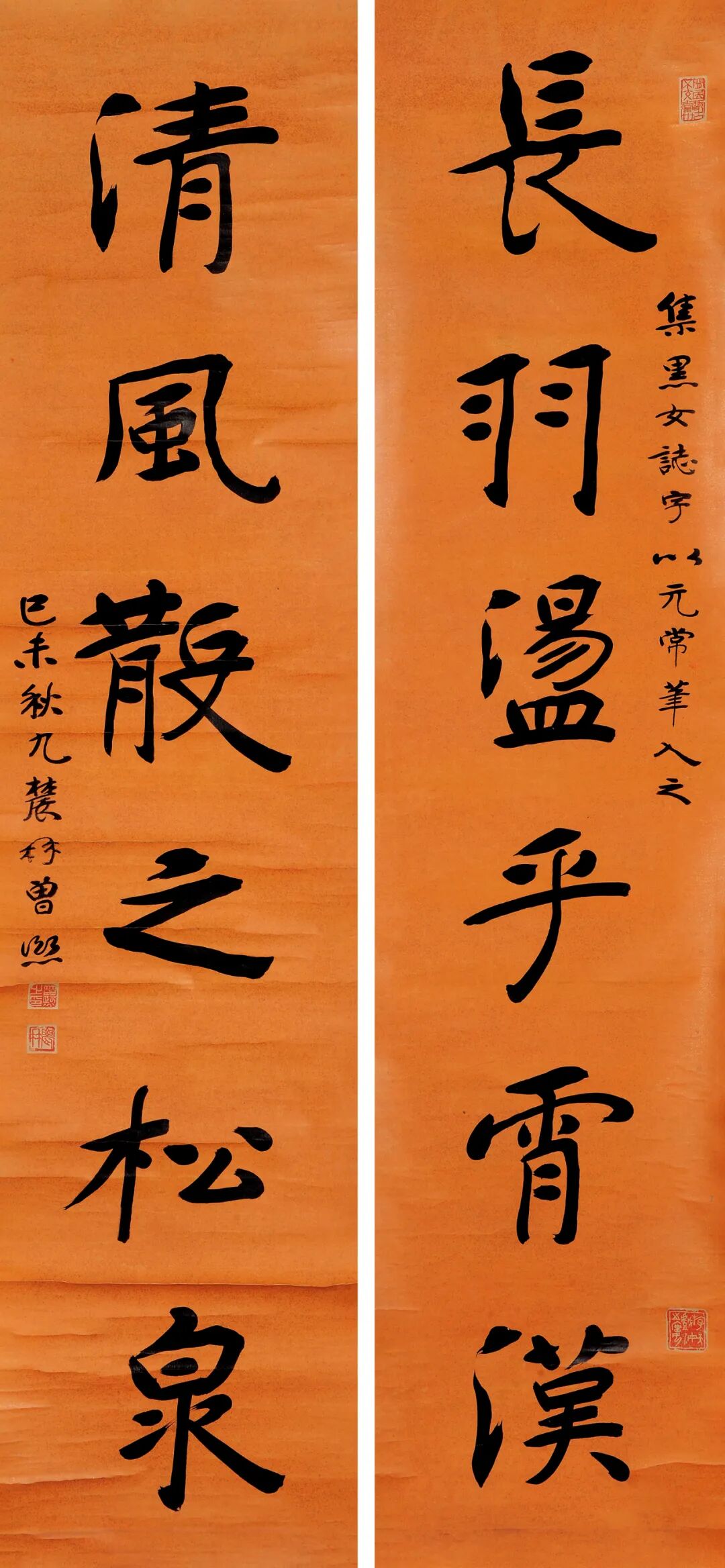 不管是书还是画,清季海派的宗师吴昌硕都是绕不过去的丰碑。本场所搜其《行书七言诗》早年为日人旧藏,书缶老自述行状诗,为其1910年代标准风格,骨格清劲,老而弥辣;又康南海书赠山东曲阜县长汪皎忱的《行书五言联》尺幅阔大,结体富赡,的为用心之作;郑孝胥高足“百郑斋”主人张谦旧藏的苏戡《行书论书六屏》系书赠陕西旬邑人肖之葆(1869-1945)之作,骨力峭拔,清癯瘦劲。曾熙分别作于1919年及1929年之《行书集张黑女六言联》《行书五言联》可窥农髯用力之处,风标独具,正可卓然成家。