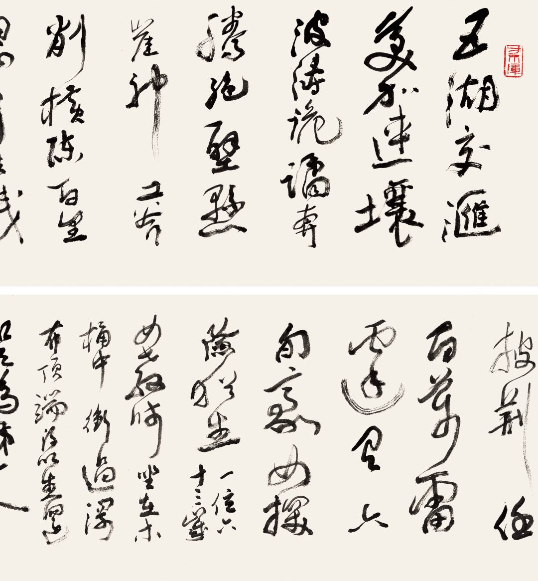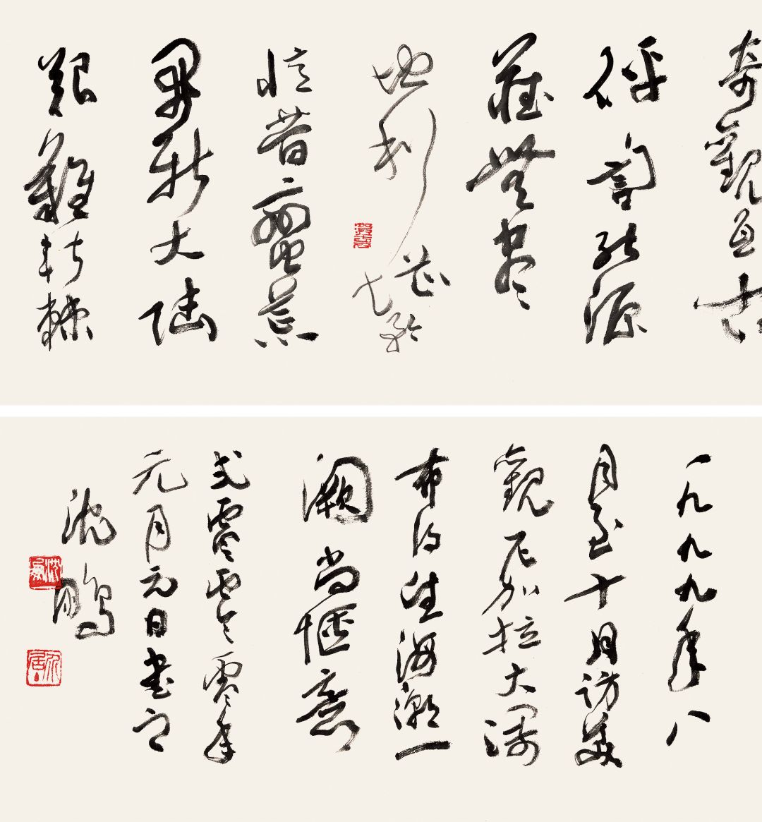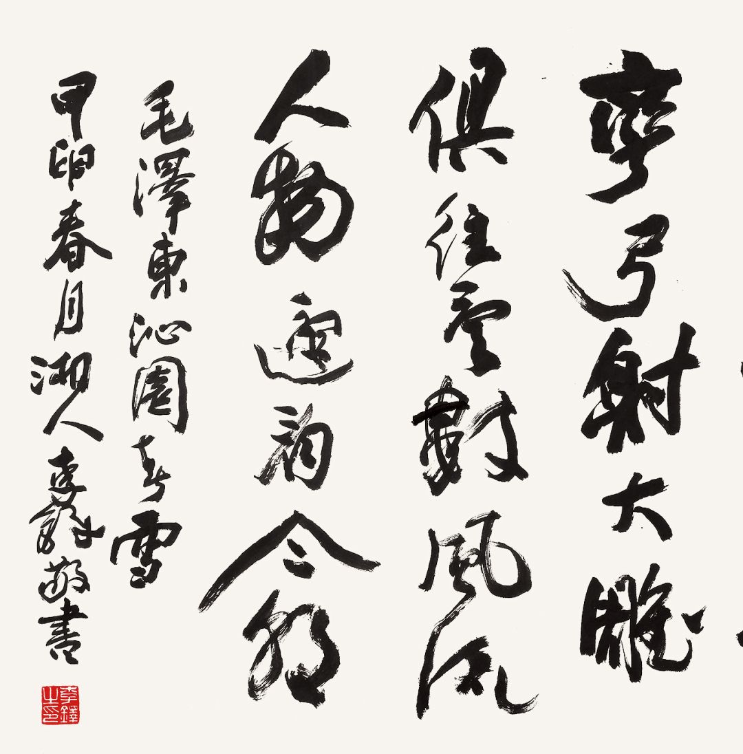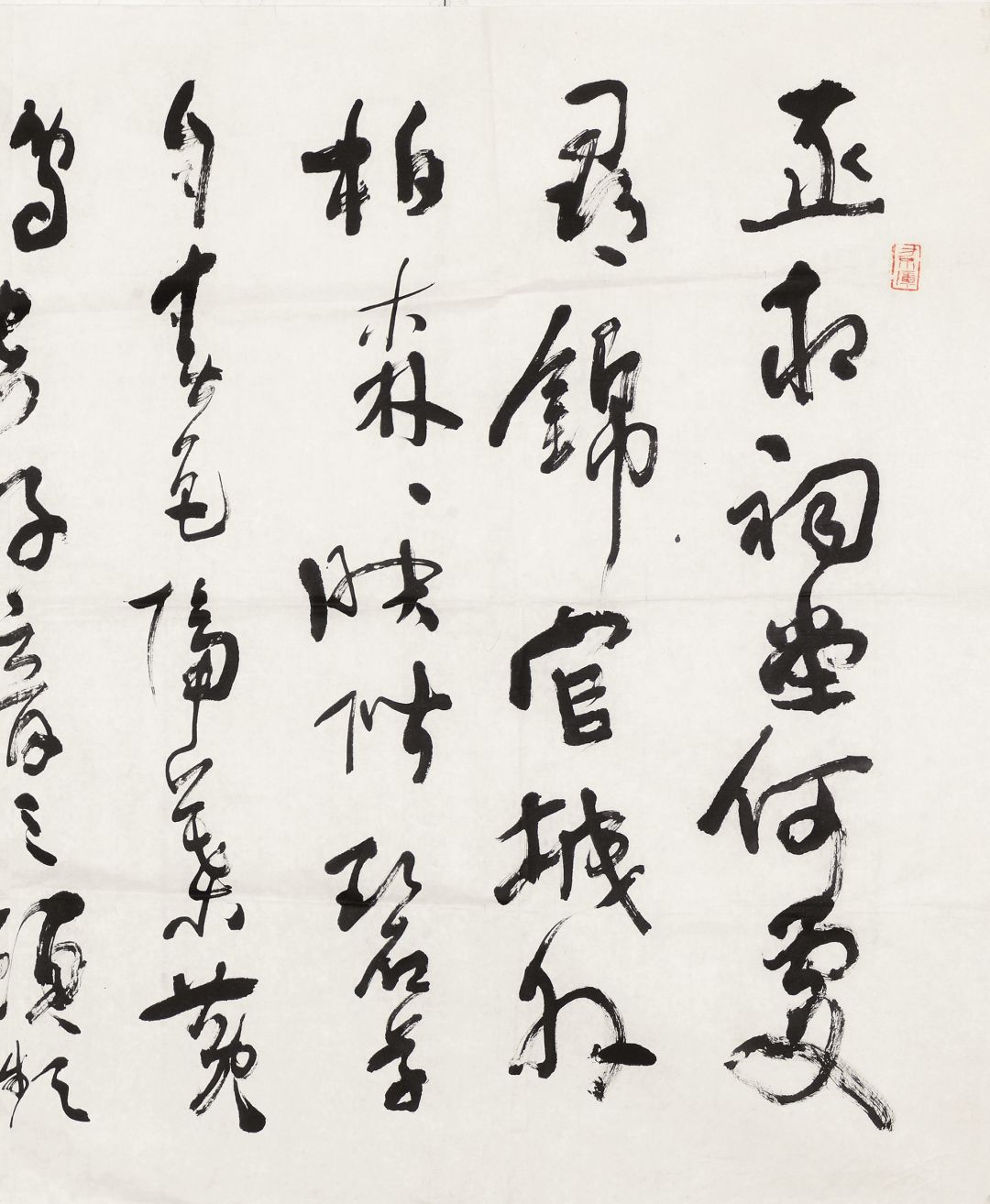 此外,我们还遴选了自舒同以降中国书协的历任主席副主席的数十件作品。其中沈鹏书赠委托人的《草书杜甫蜀相诗》颇能代表其该时期书风,枯墨润墨交错,快笔慢笔杂行,合圆转歧侧方磔于一体,直是大家风范。军旅大书家李铎《行书毛主席词》及欧阳中石两件行书均系巨幅,李书气势恢宏,欧书则流丽婉转。