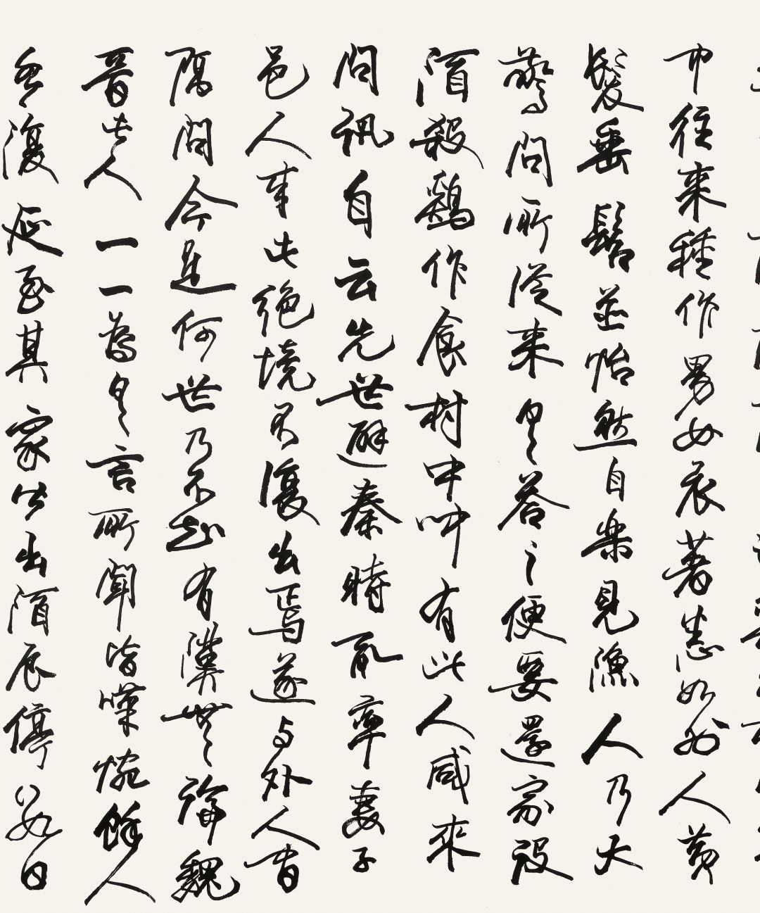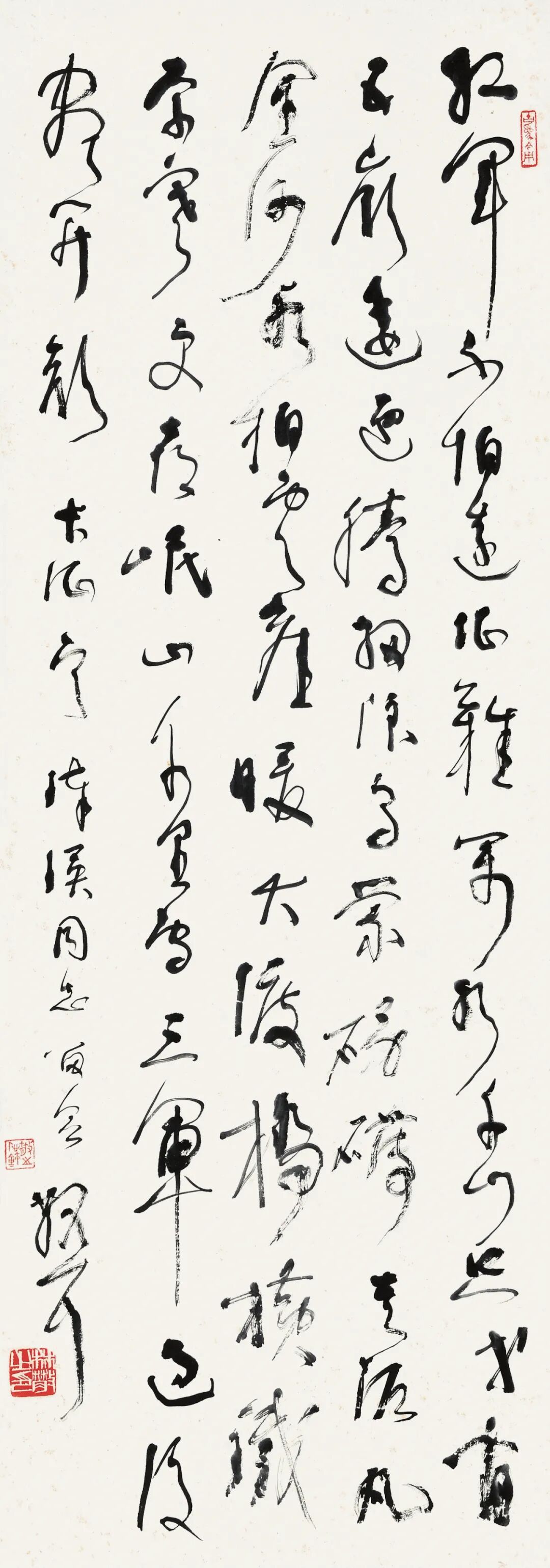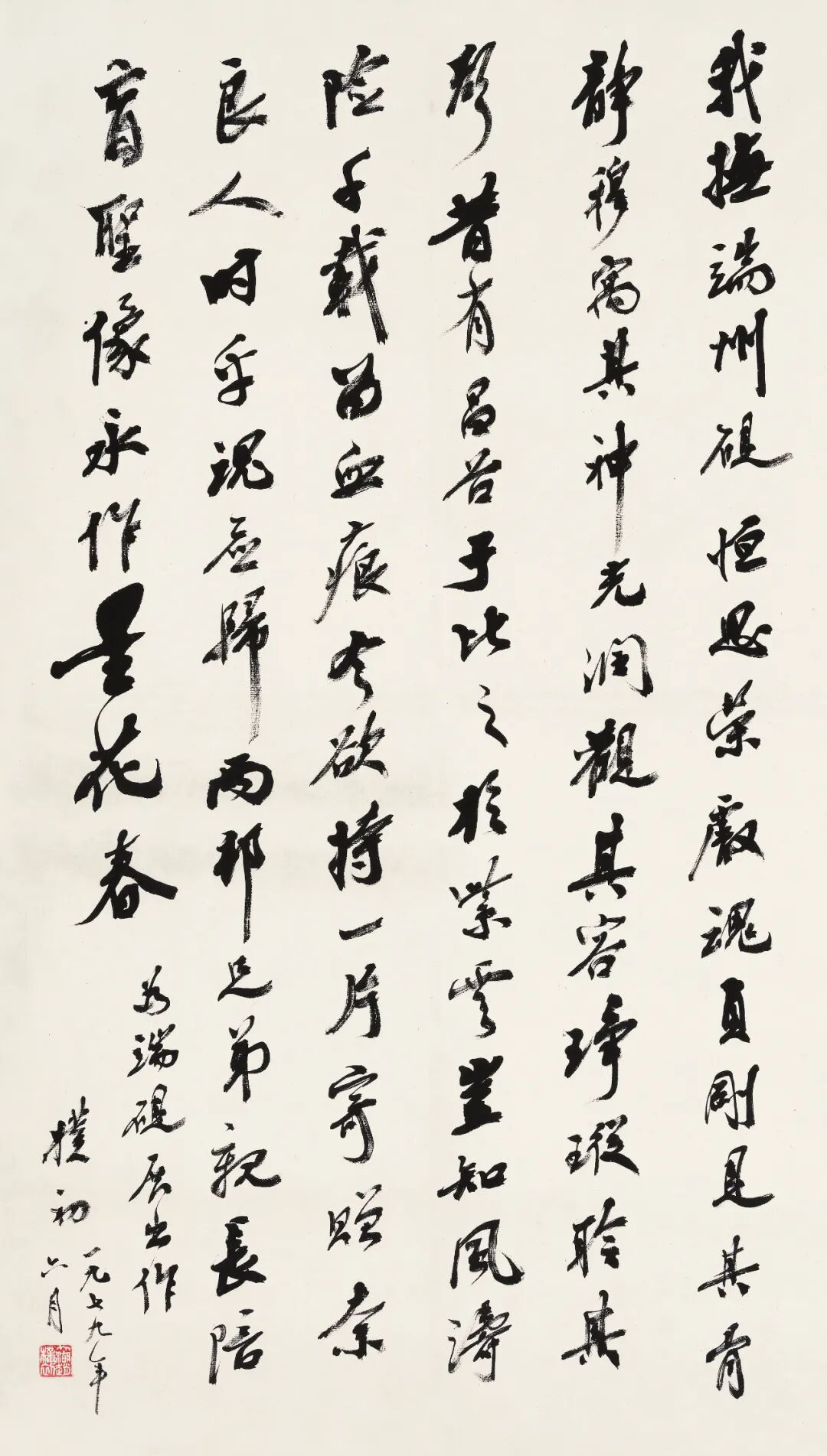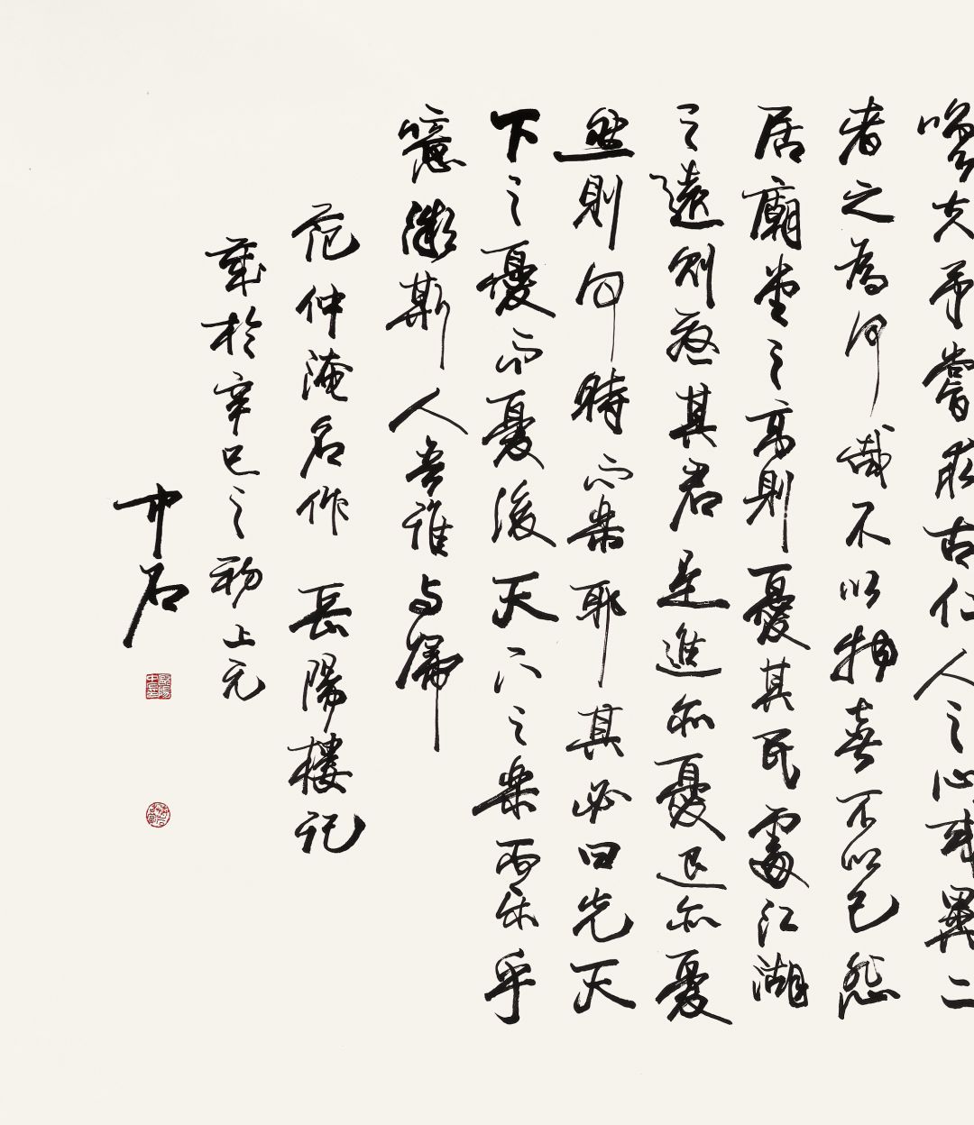 此外,我们还遴选了自舒同以降中国书协的历任主席副主席的数十件作品。其中沈鹏书赠委托人的《草书杜甫蜀相诗》颇能代表其该时期书风,枯墨润墨交错,快笔慢笔杂行,合圆转歧侧方磔于一体,直是大家风范。军旅大书家李铎《行书毛主席词》及欧阳中石两件行书均系巨幅,李书气势恢宏,欧书则流丽婉转。
