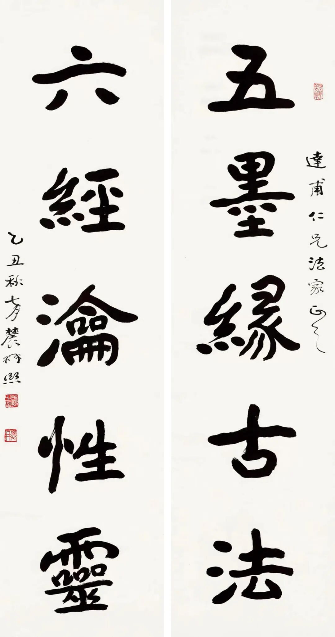 近百年中国书坛,足称风格独具之大匠,除上述诸人外,于右任、谢无量自然不能无视。以一部大胡子令人瞩目的于右任同时以一己之力创出“标准草书”、有“一代草圣”之誉,早年用力魏碑,中年以后渐趋平淡天真,了无烟火气。赠襟宇之《行草五言联》骨力慷慨,似乎可见其壮怀激烈。与之相反,面白无须的谢无量倒是天真散淡,类于周作人的小品文,白开水一样,书中一副“采菊东篱下,悠然见南山”的闲适平和,颇有“心远地自偏”的况味。
