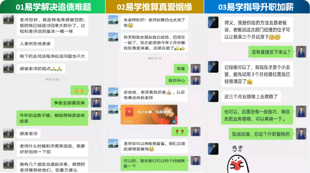没时间观看直播也没关系,在学习周期内,可以无限次回看,方便大家巩固学习。为了确保每一位同学都能掌握易学知识,每个社群中都有专属班主任全程一对一督导,为你答疑解惑。福利来了!课堂上积极表现的学员还能享受班级内部的专属解卦服务!爱情、事业、财富、婚姻、性格,无论你是想克服眼前的困境,还是测算未来的运势,易学都能帮你找到人生破局的最佳答案,从此你的人生将变得: