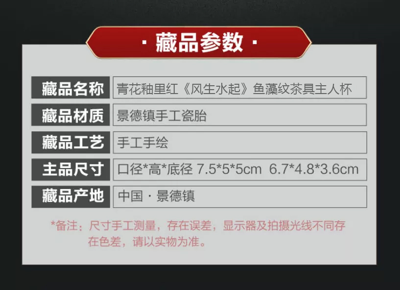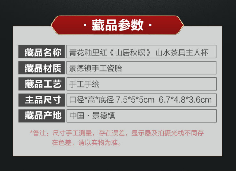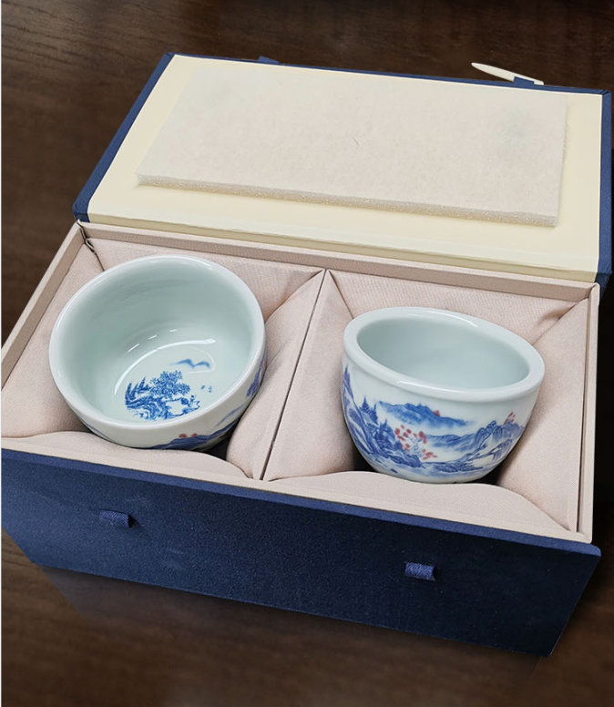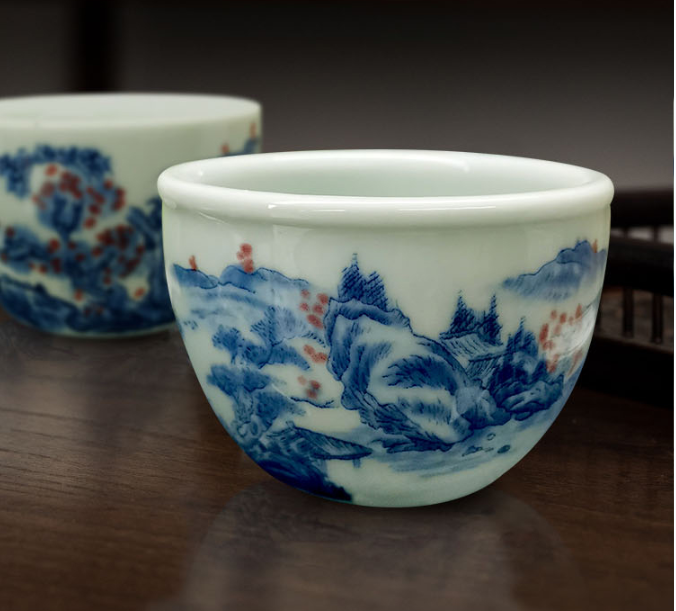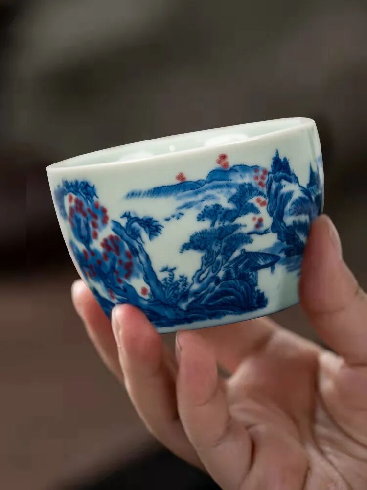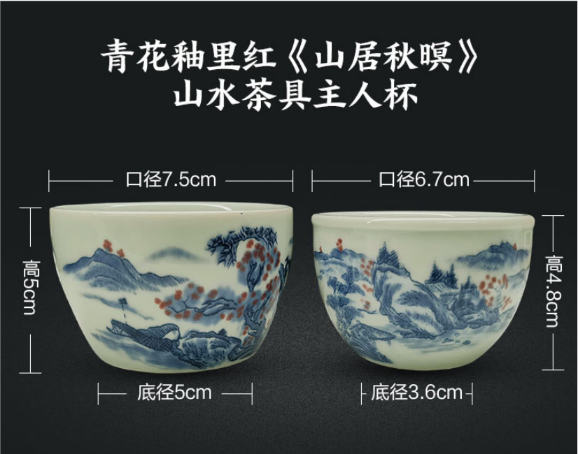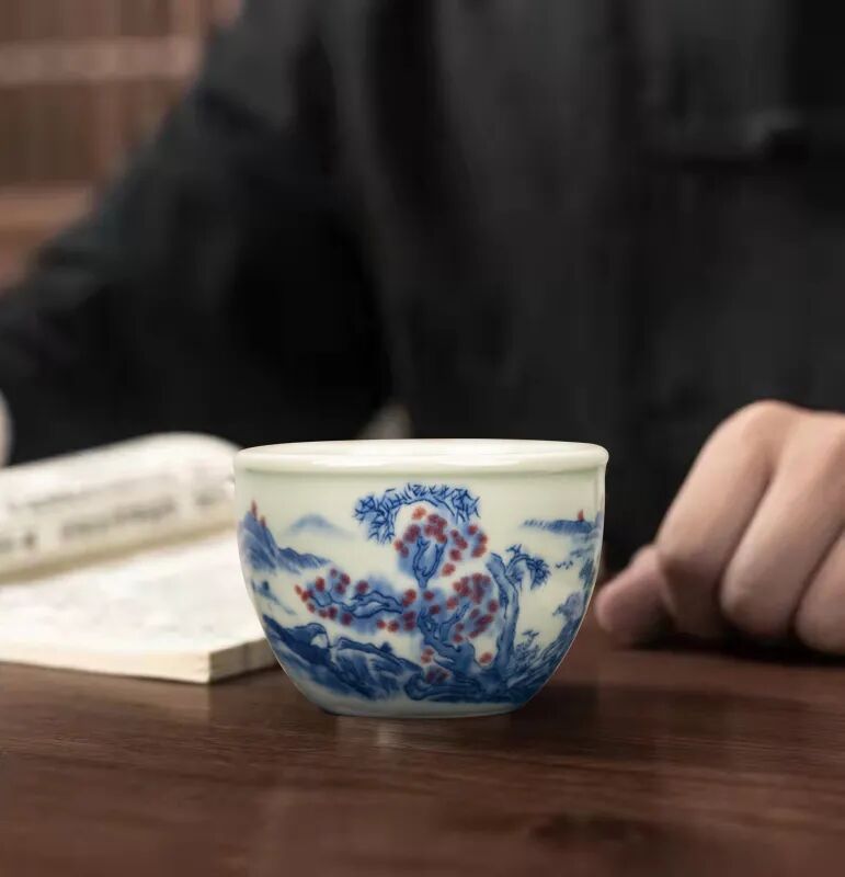 品茗嘬饮,该有一套得心应手的茶具,美器与美事相伴,才尤为风雅。今天为大家推荐一套青花釉里红主人杯,中国陶瓷博物馆全程全力监制,中国国瓷画院副院长兼秘书长许国胜手工绘作,正宗柴窑松木烧制,经典青花和釉里红釉彩相映成趣。两种款式,任君选择,一款《山居秋暝》山水主人杯,将山水胜景呈于杯上,成为茶席上的一方风景。