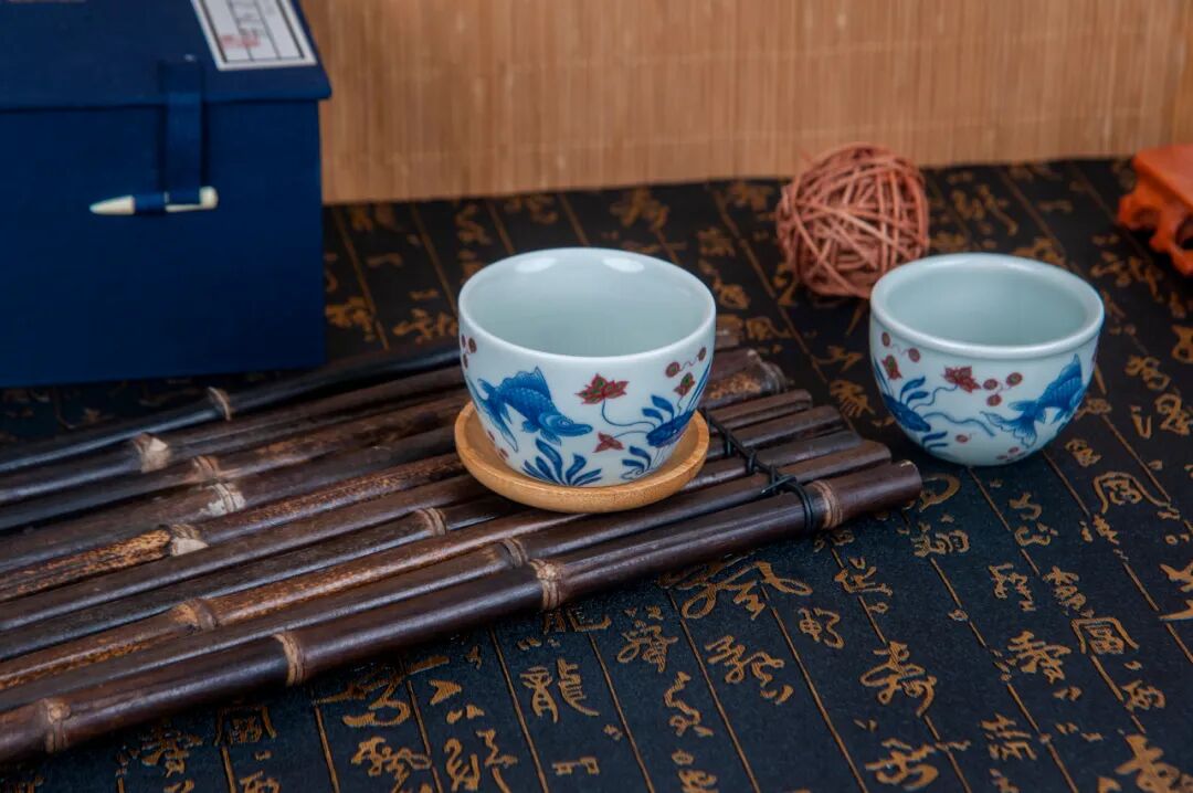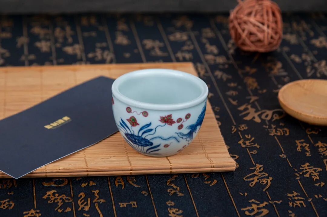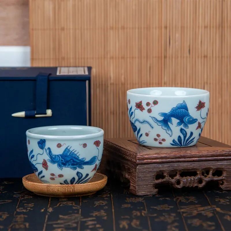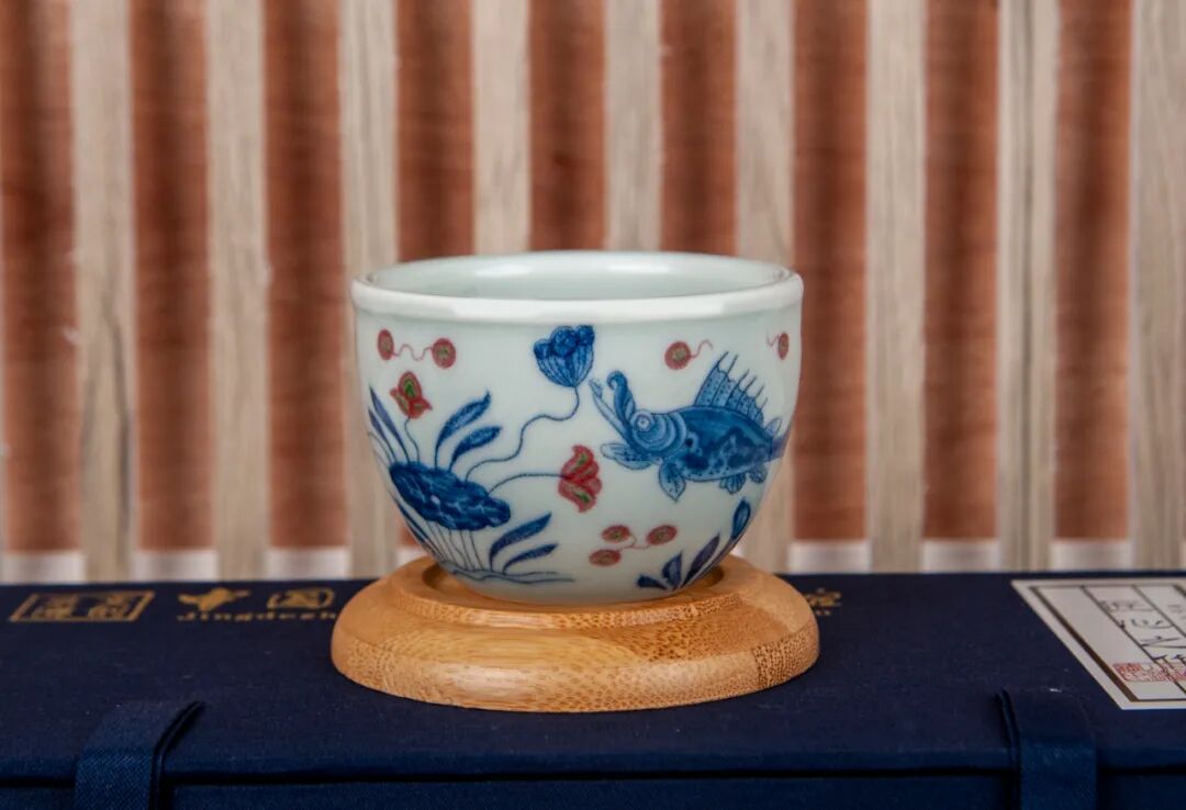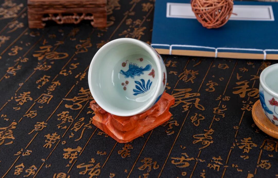 又用釉里红在画面之上点缀,使得画面丰富,别有生趣。杯内底部也绘有一尾鱼,倒入茶水,如同鱼游其中,妙不可言。